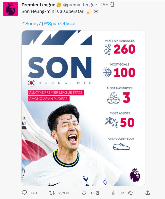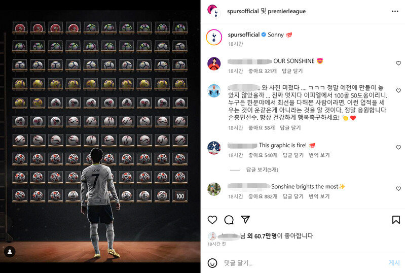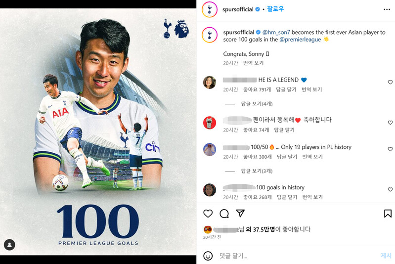 These photos are captures from Premier League and Tottenham Hotspur's SNS account celebrating Son Heung-min's 100th goal in the English Premier League (EPL) on April 8, 2023. Son became the first Asian player to achieve the feat. (PHOTO NOT FOR SALE) (Yonhap)