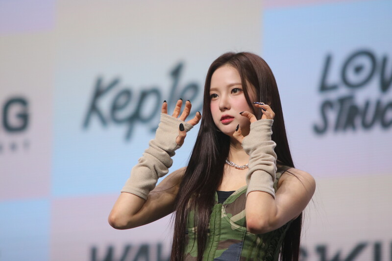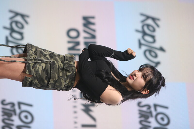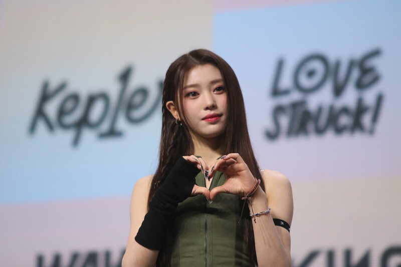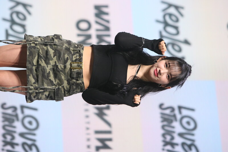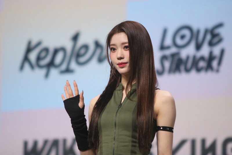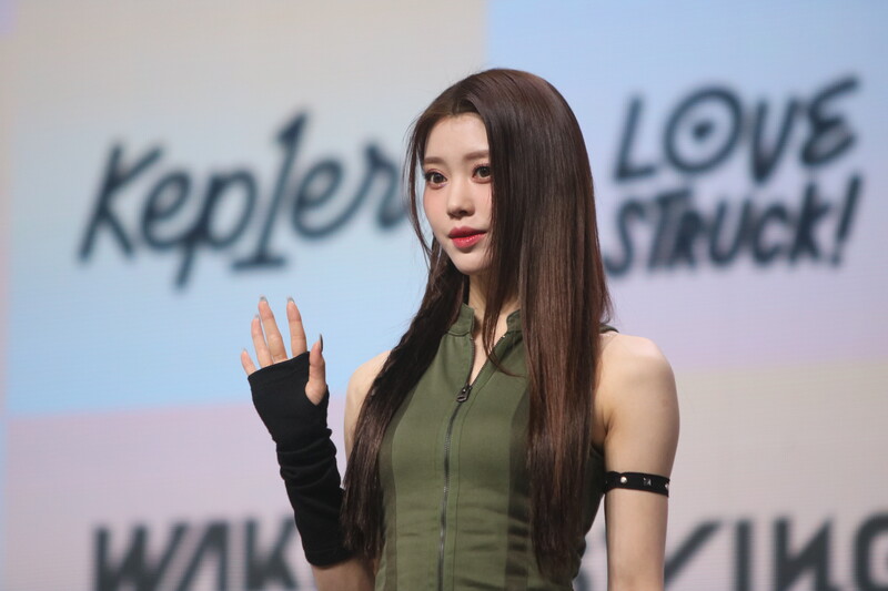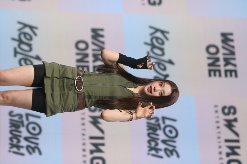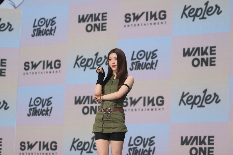 These photos show Kep1er's Choi Yu-jin, Shen Xiaoting, and Sakamoto Mashiro during the media showcase of the nine-piece group's fourth mini album "LOVE STRUCK!," led by title track "Giddy."