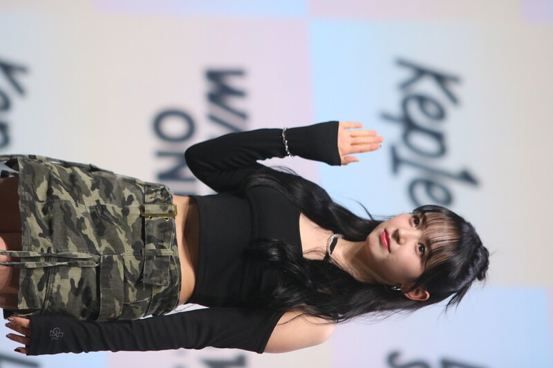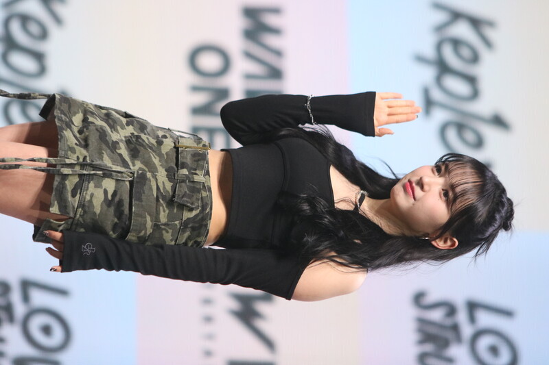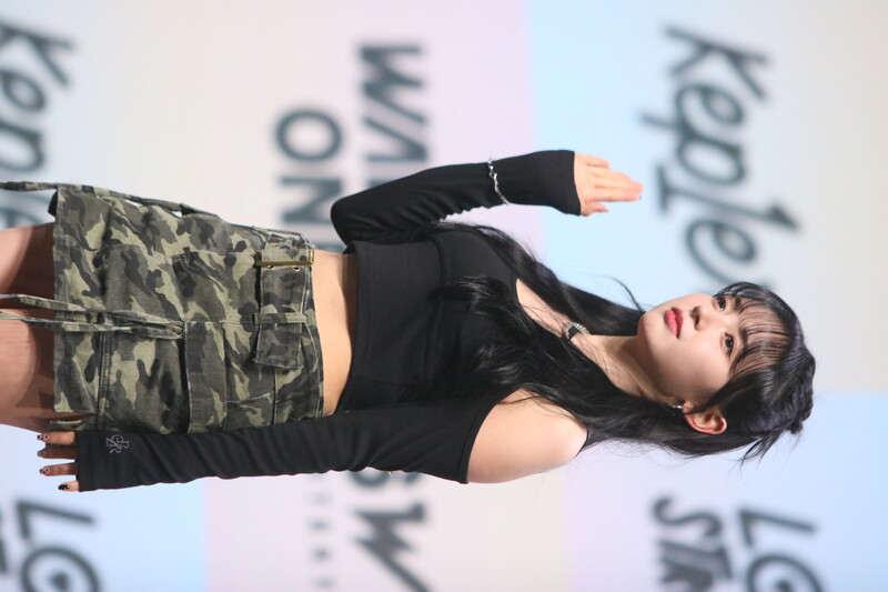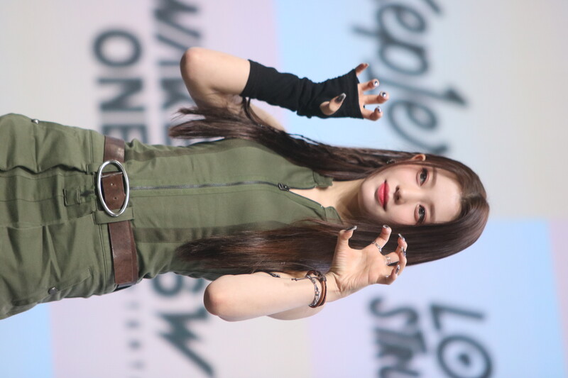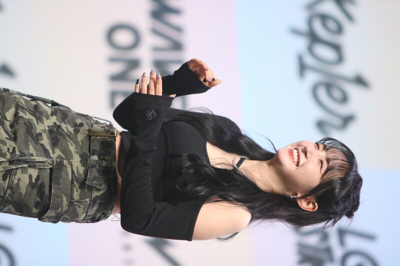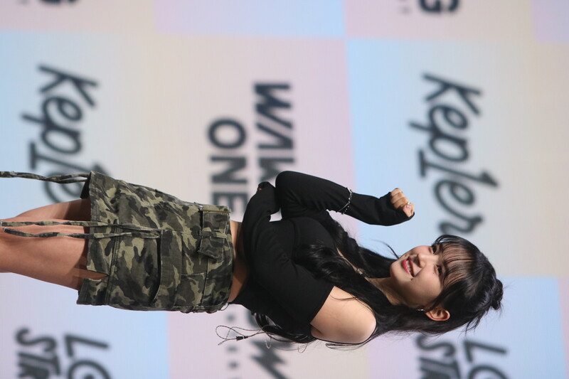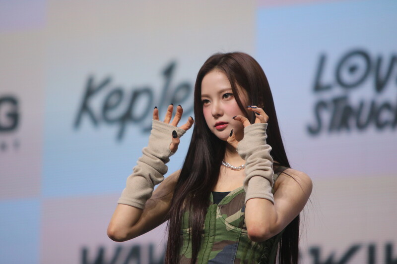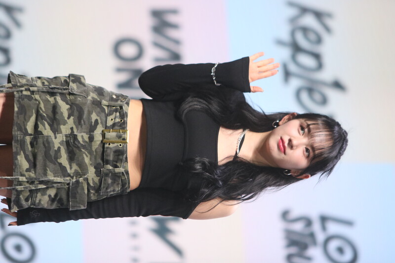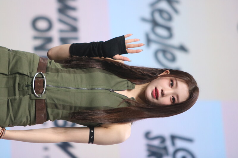 These photos show Kep1er's Choi Yu-jin, Shen Xiaoting, and Sakamoto Mashiro during the media showcase of the nine-piece group's fourth mini album "LOVE STRUCK!," led by title track "Giddy."