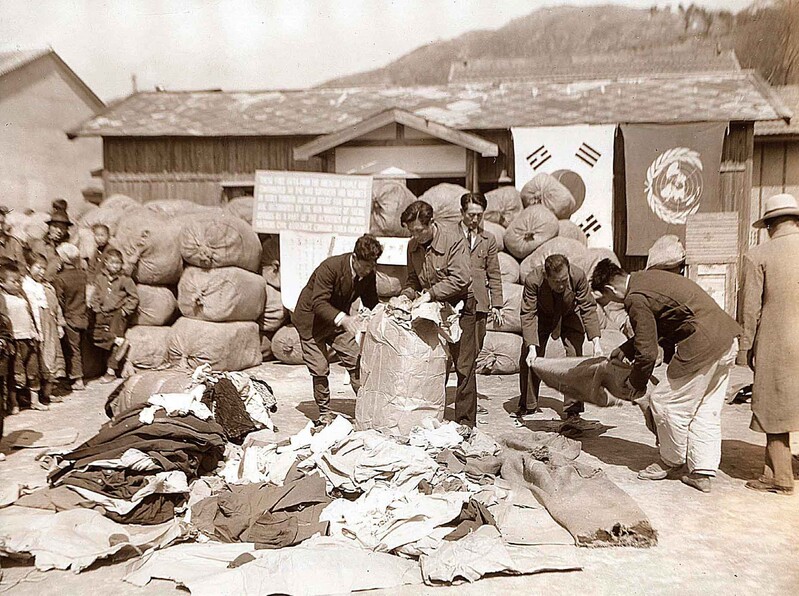 | ▲ 1952 People unpack clothing donated by the American Red Cross during the height of the Korean War. (Photo courtesy of the Ministry of Public Administration and Security) |
