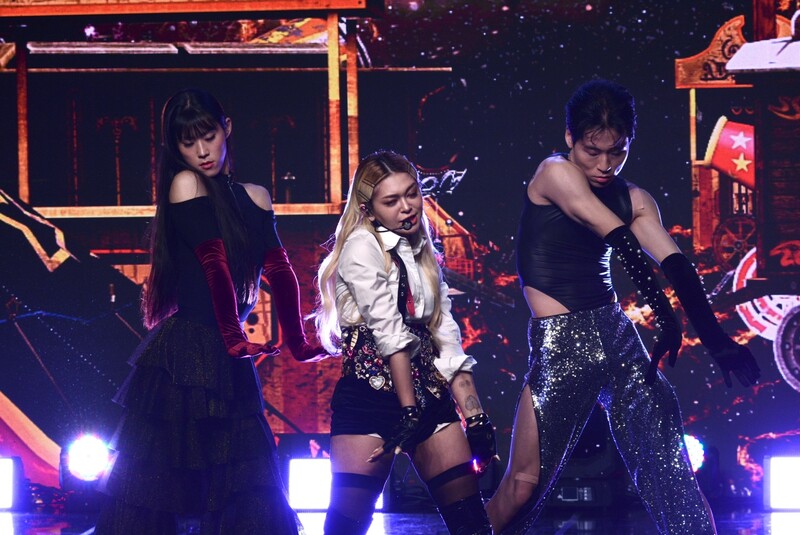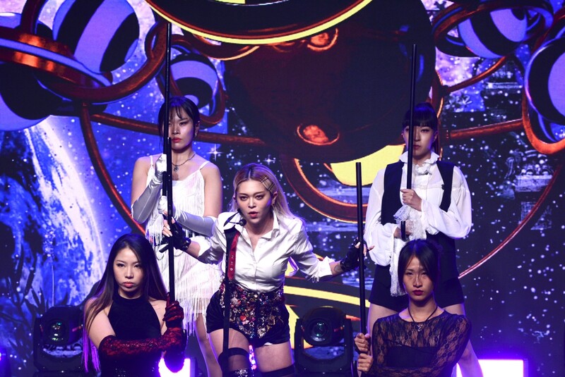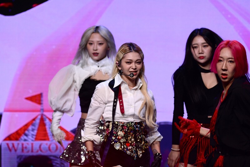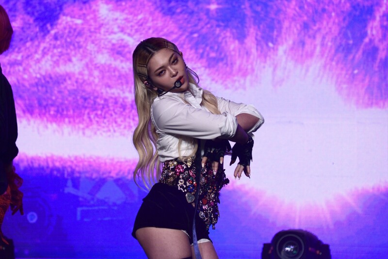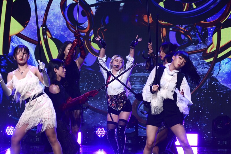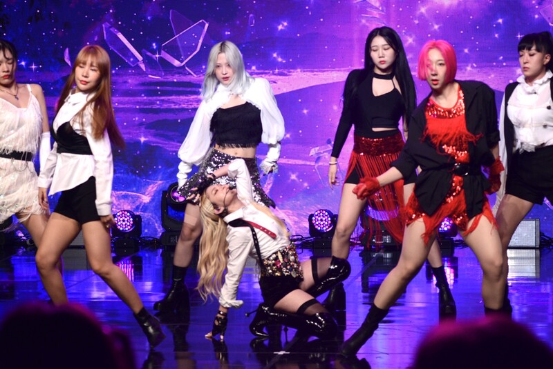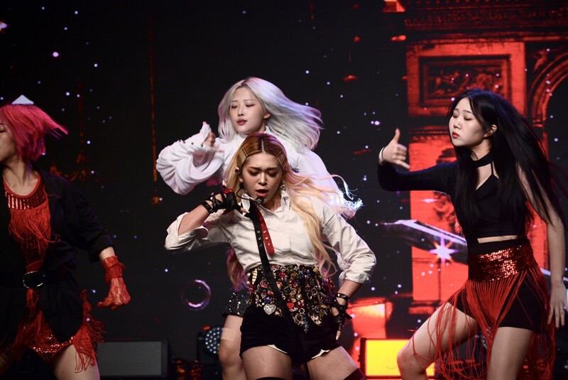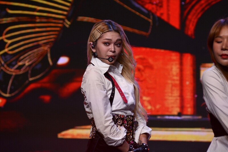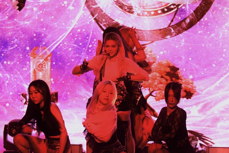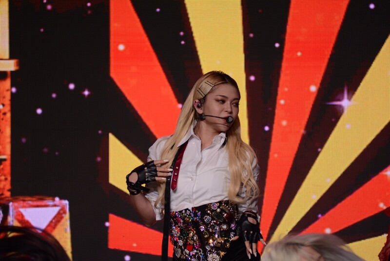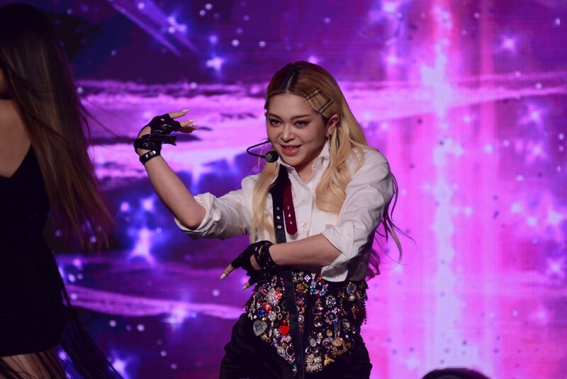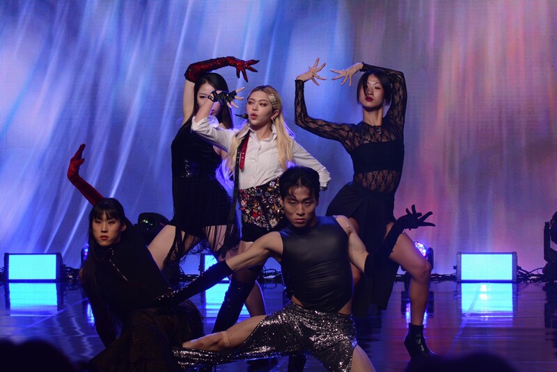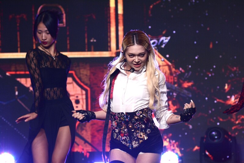 These photos, taken during the media showcase of female K-pop artist Alexa's mini album "Girls Gone Vogue" show Alexa performing her title track "Back In Vogue."