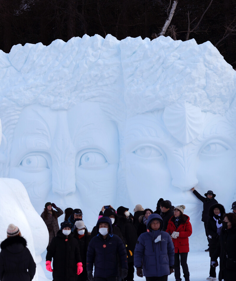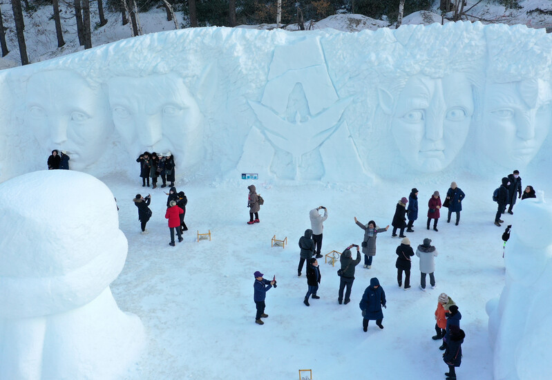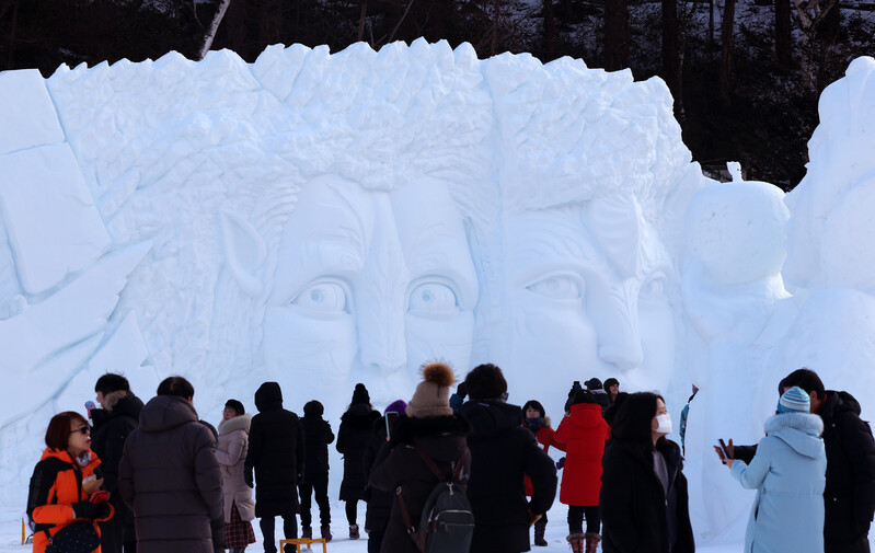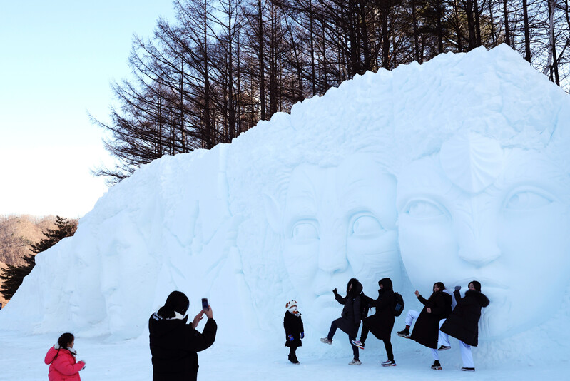 People pose for photos with sculptures made with snow in Taebaek, 271 kilometers east of Seoul, on Jan. 29, 2023.