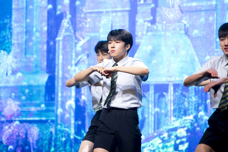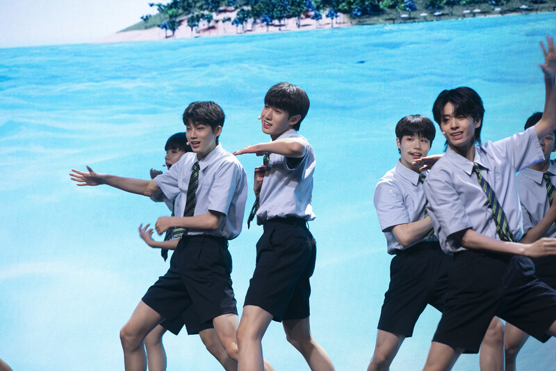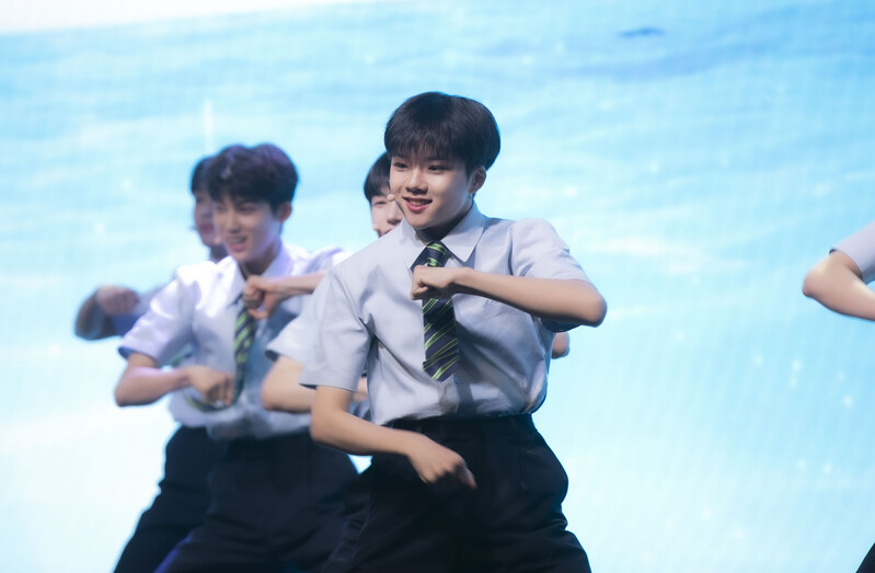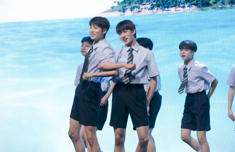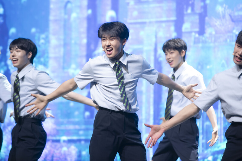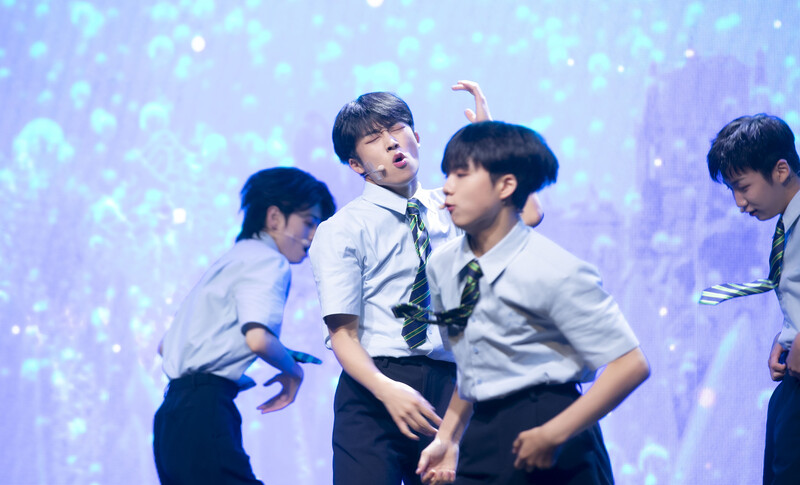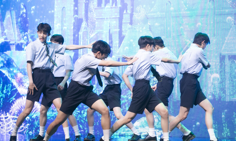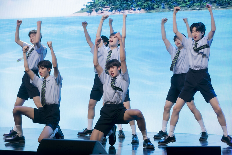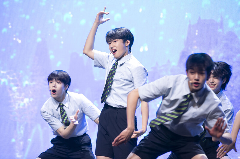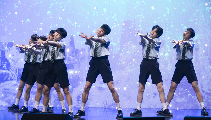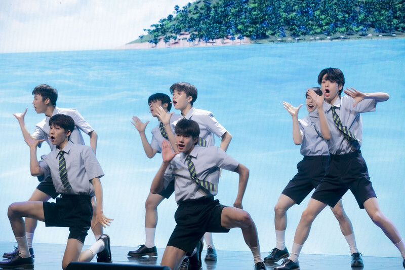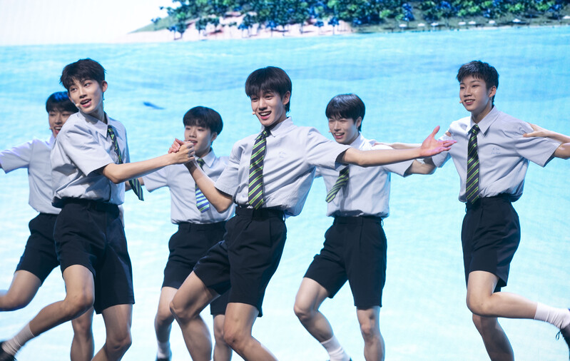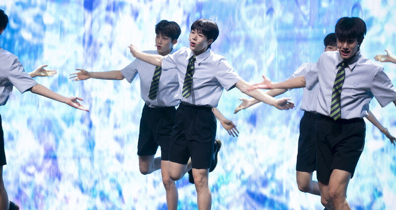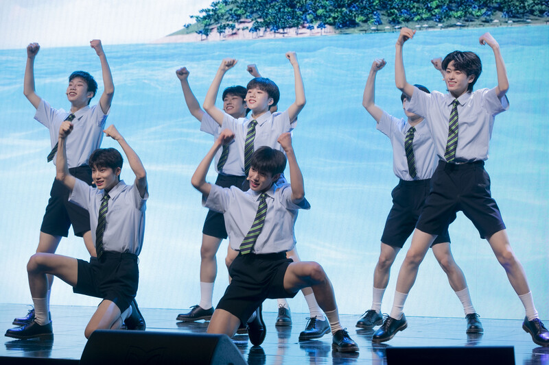 These photos, taken during the debut media showcase of K-pop boy group "The Wind" show, members performing their lead track "Island."