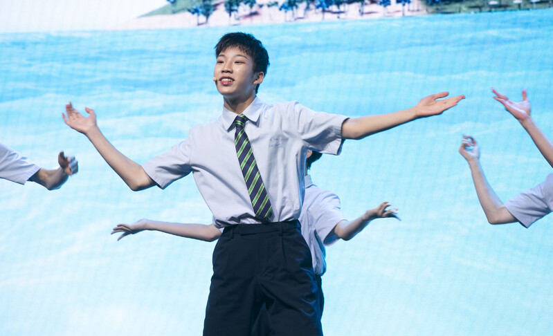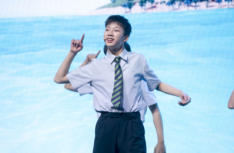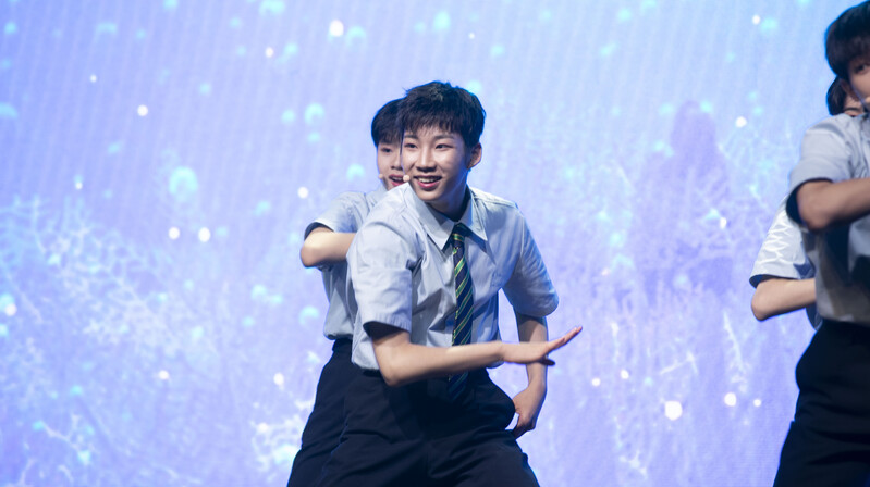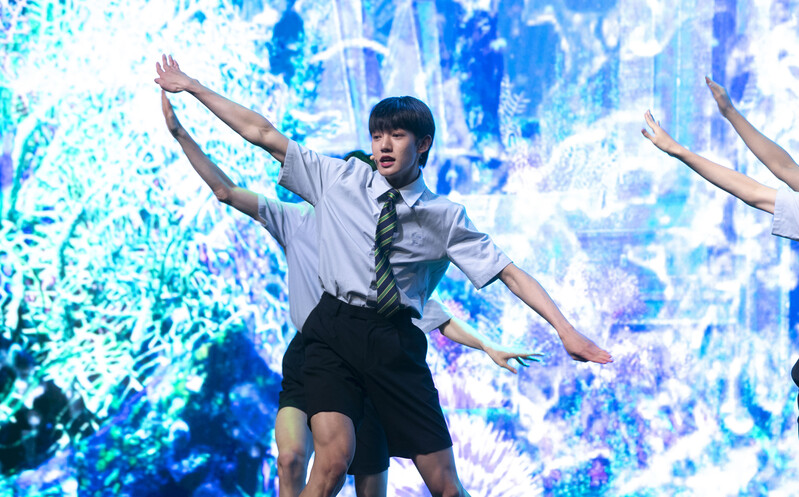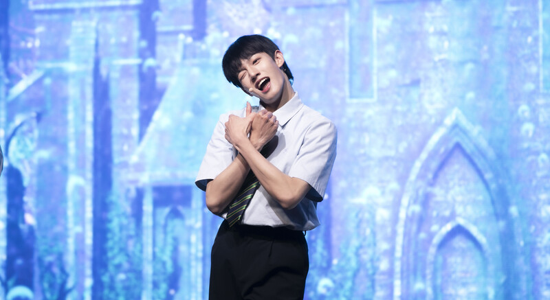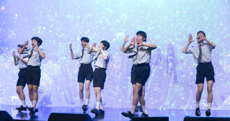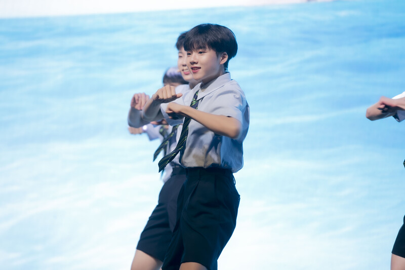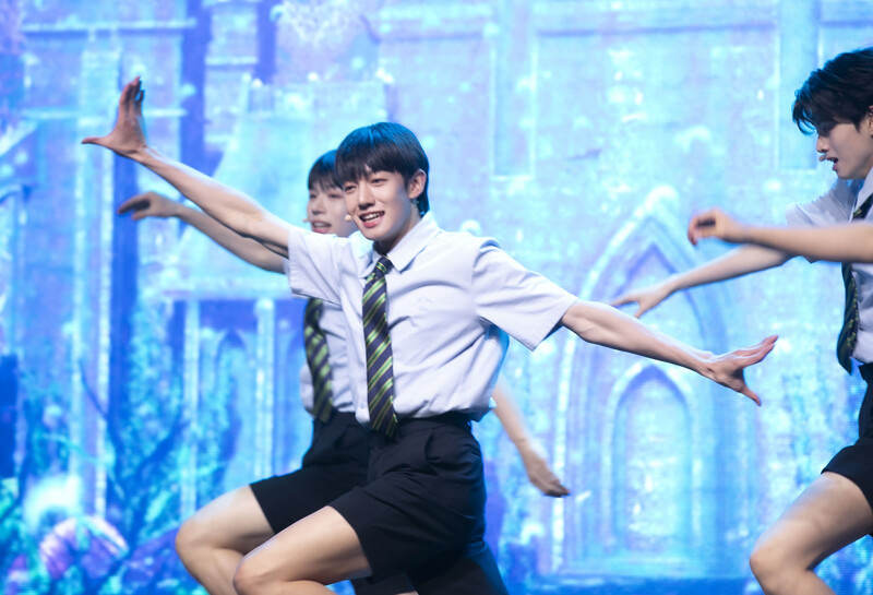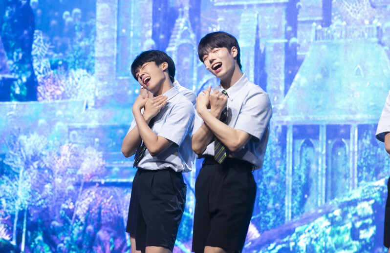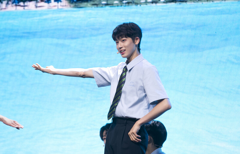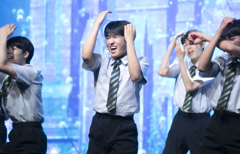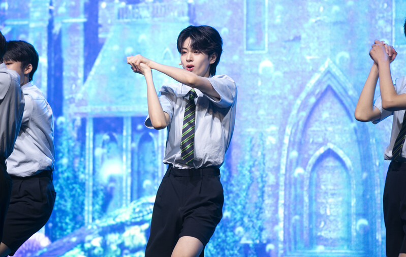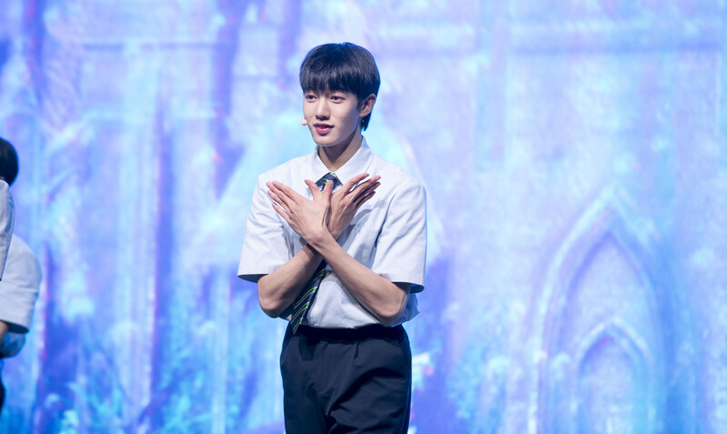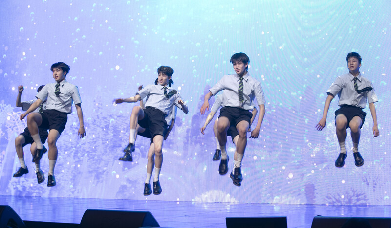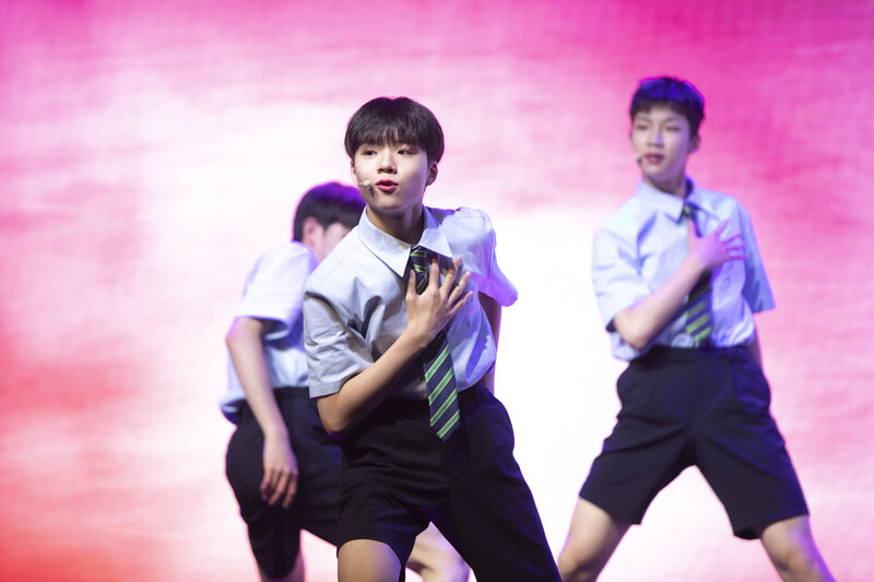 These photos, taken during the debut media showcase of K-pop boy group "The Wind" show, members performing their lead track "Island."