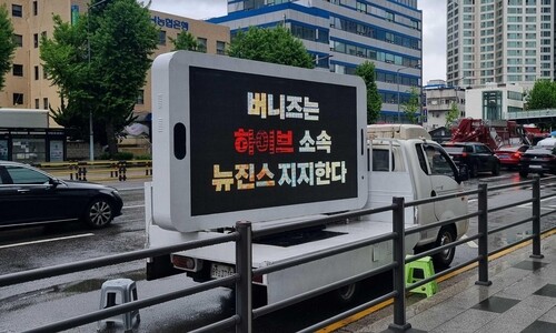 | ▲ This image provided by a reader shows a protest truck deployed by fans of NewJeans outside the building of K-pop giant Hybe in Seoul on April 24 |