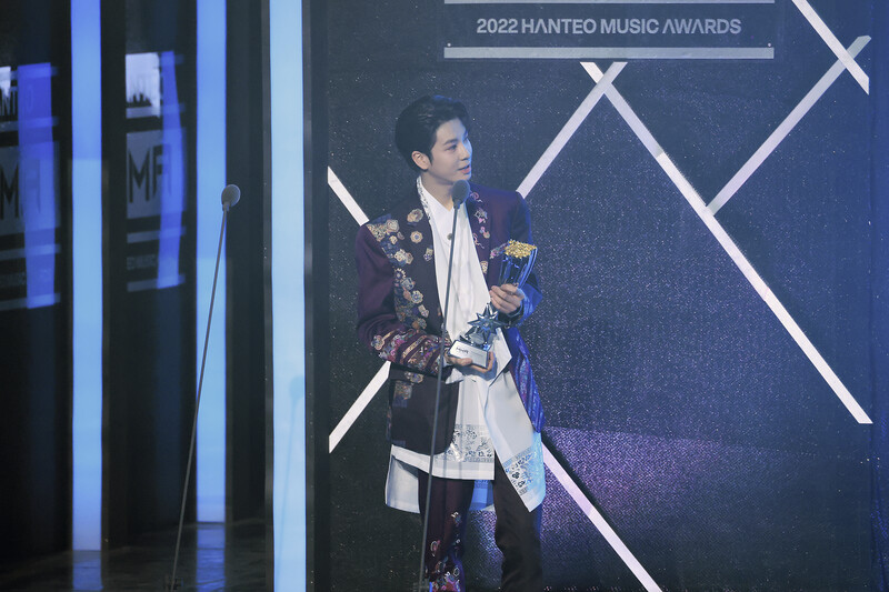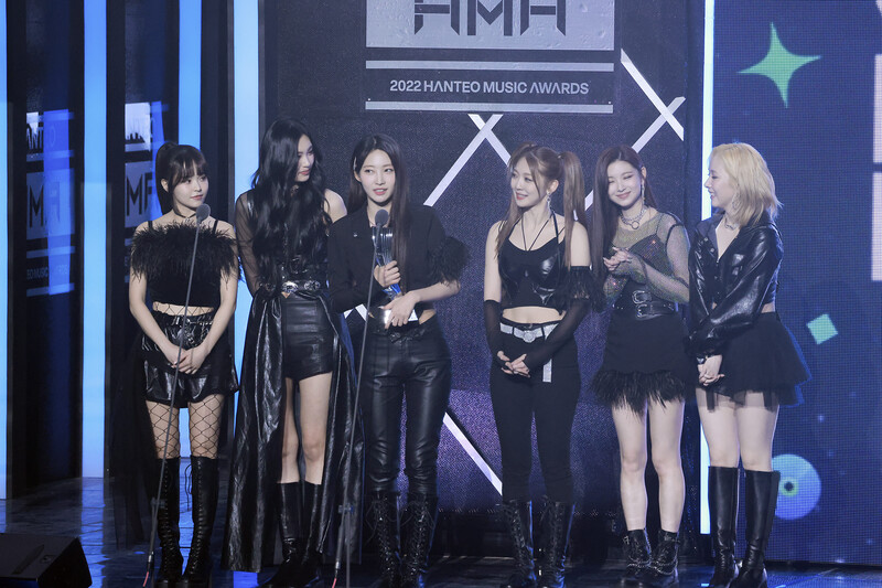These photos, provided by Hanteo Music Awards, show Billlie, WEi receiving Emerging Artist and EVERGLOW, Jung Dongwon receiving Post Generation.