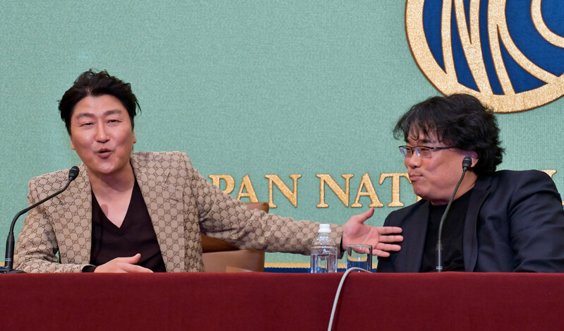 | ▲ This photo, provided by Keizo Mori/UPI, shows South Korean actor Song Kang-ho(L) and Director Bong Joon-ho, Oscar winner of Best Original Screenplay, Best Director and Best Picture for "Parasite," attending the press conference in Tokyo, Japan on Sunday, February 23, 2020. This film's some shooting locations have become tourist sites in Seoul, South Korea. |