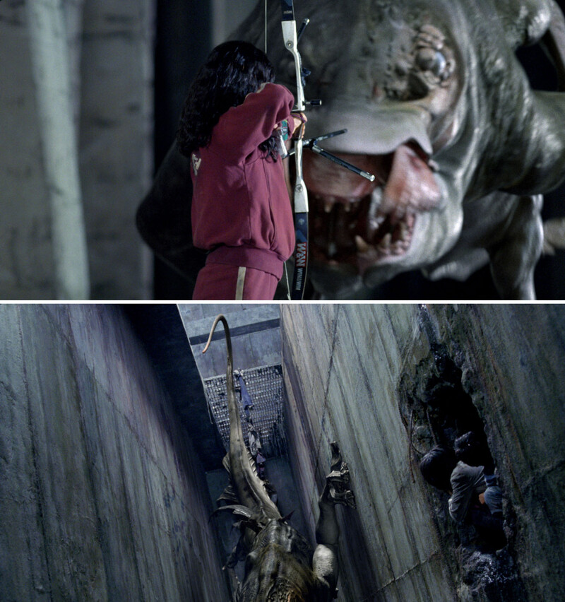 Arrows, firebombs and a metal pipe that looks like a bamboo spear, the weapons the family used to fight off the monster are noteworthy as well.