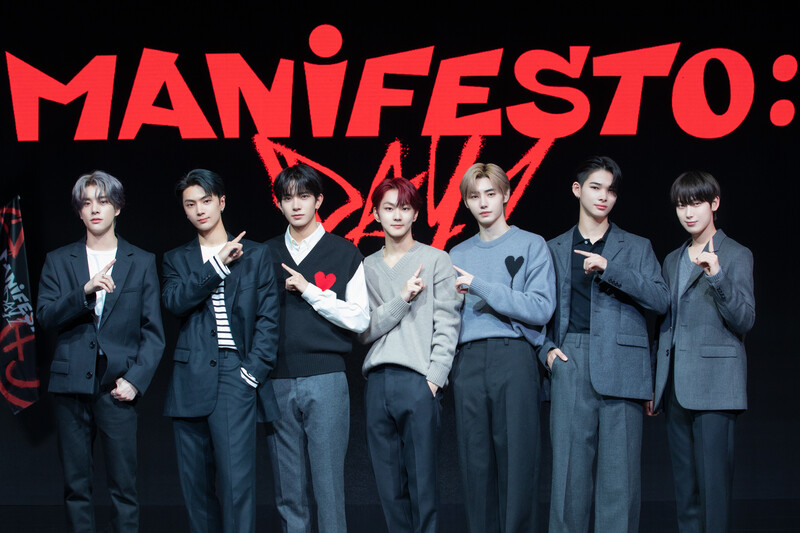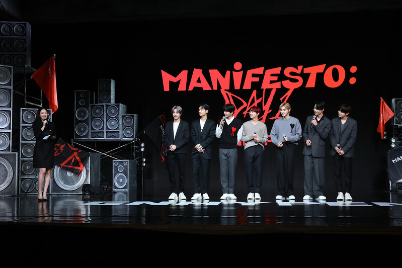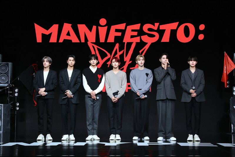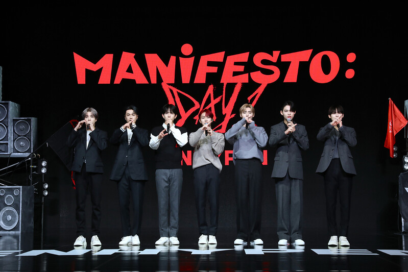 These photos, provided by Belift Lab, show ENHYPEN at the media showcase of "MANIFESTO: DAY 1," which was held on July 4 at Yonsei University 100th Memorial Hall.