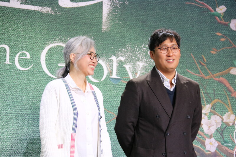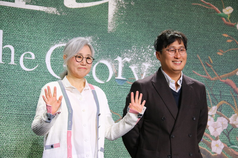 These photos show actors Song Hyekyo, Lee Dohyun, Im Jiyeon, Yun Hyeran, Park Sunghoon, Jung Sungil, screen writer Kim Eun-sook. and director Ahn Gil-ho during press conference of Netflix series "The Glory" which will be released on December 30.