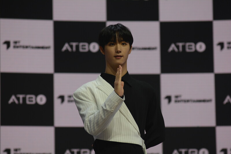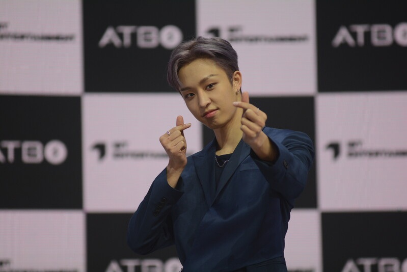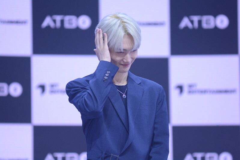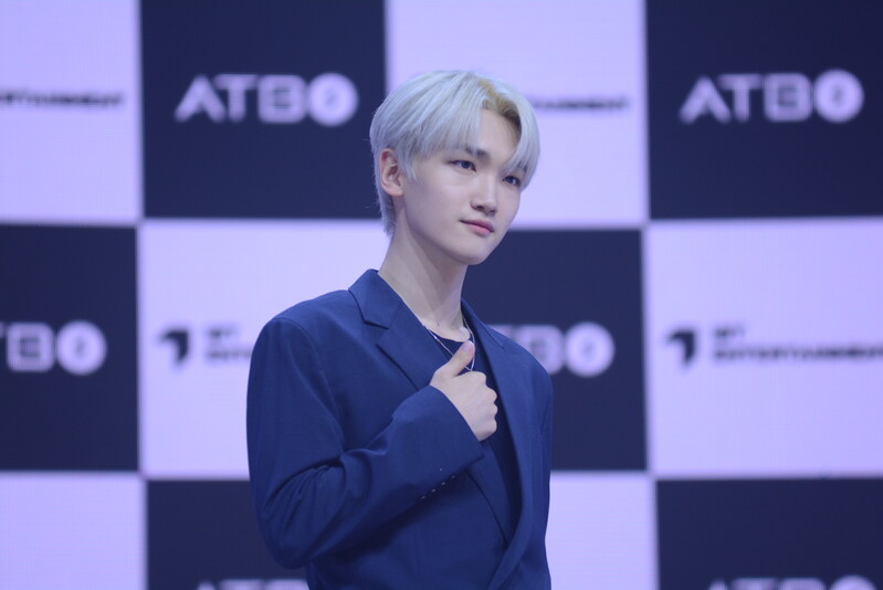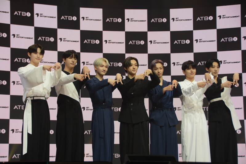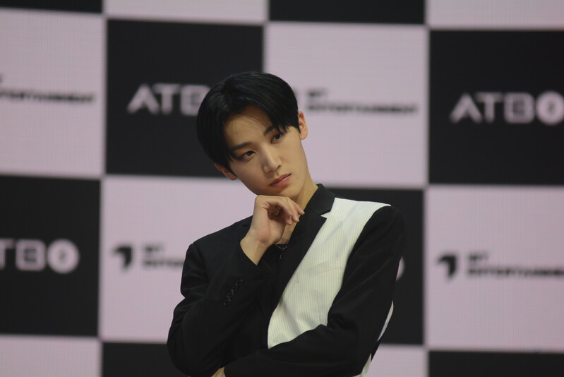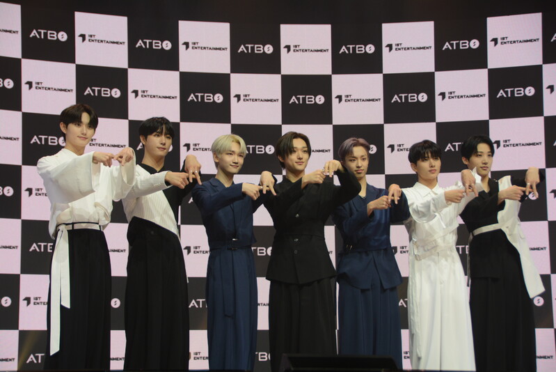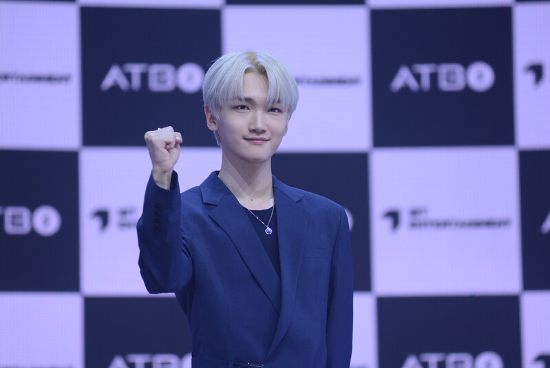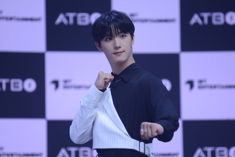 These photos taken during the media showcase of rookie K-pop boy group ATBO show members posing for their individual and group photos.