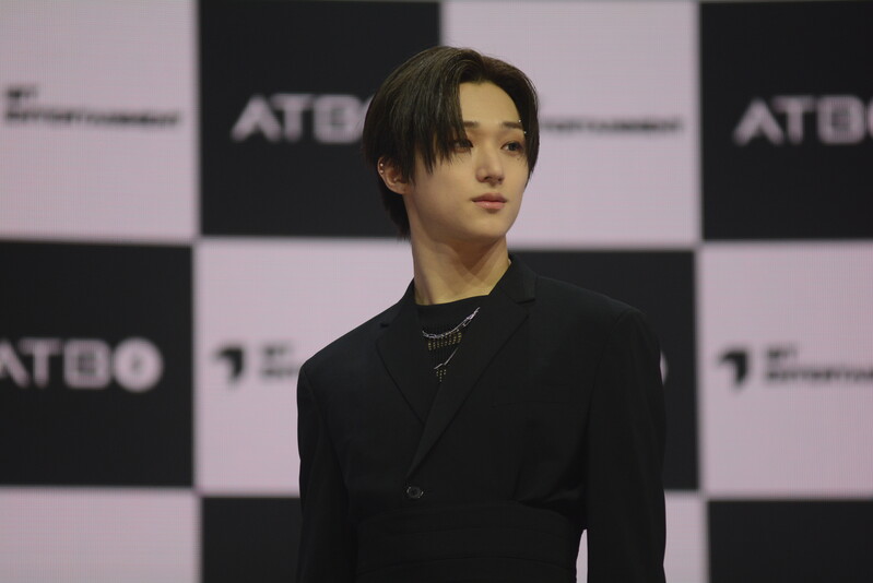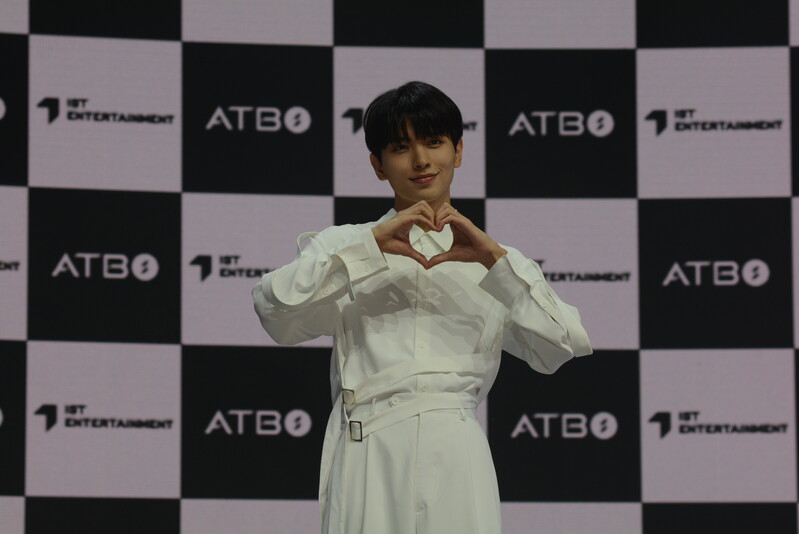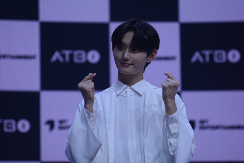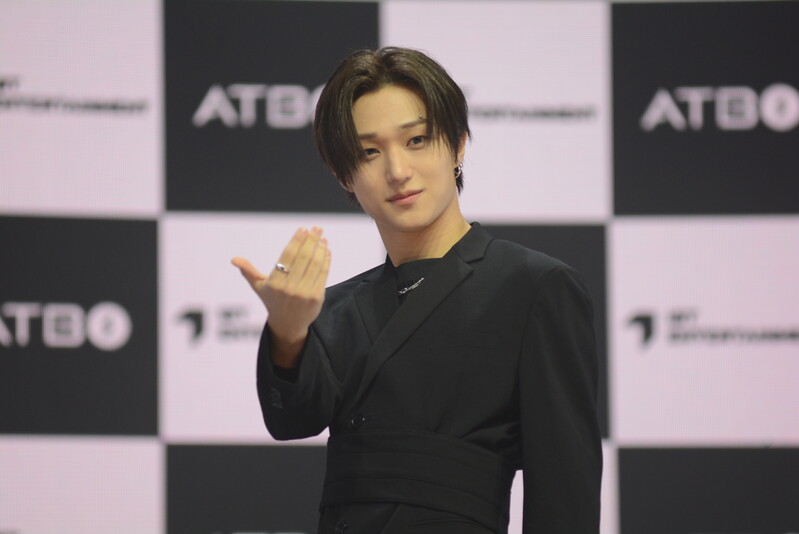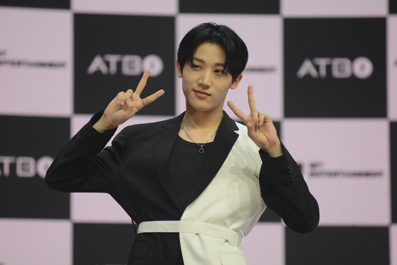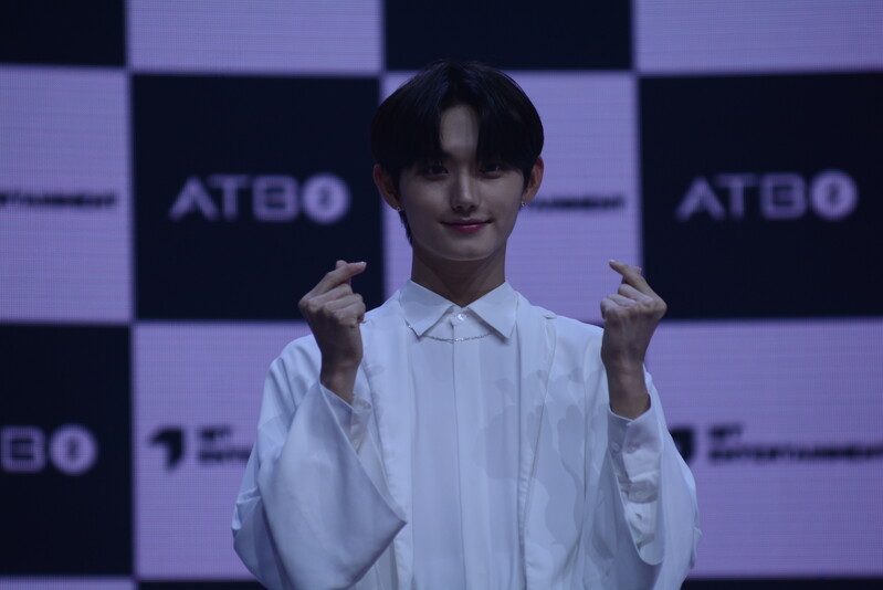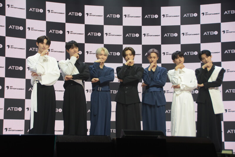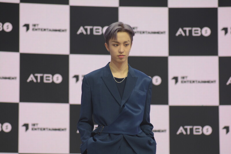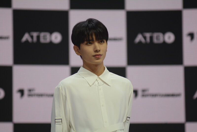 These photos taken during the media showcase of rookie K-pop boy group ATBO show members posing for their individual and group photos.