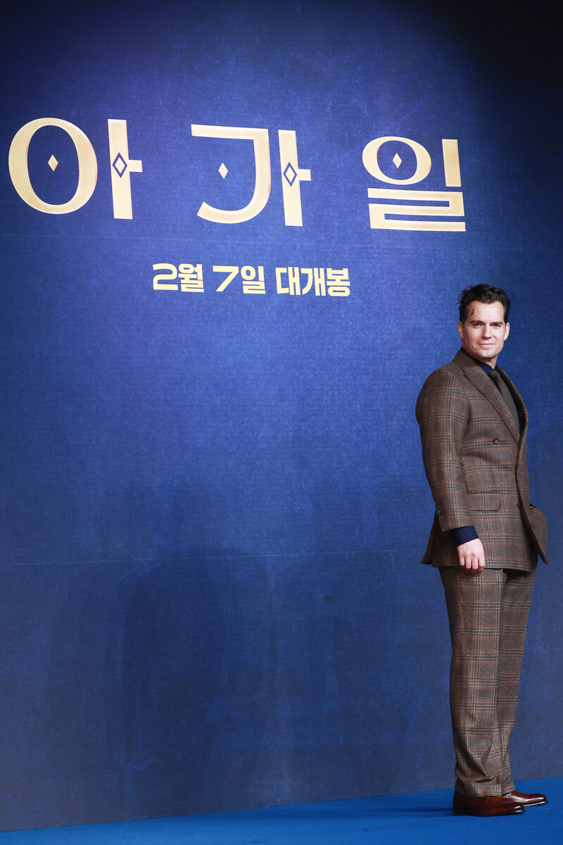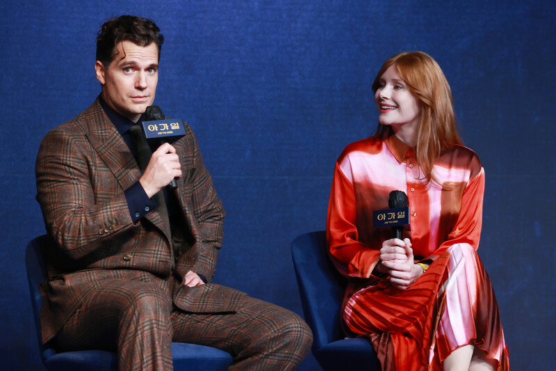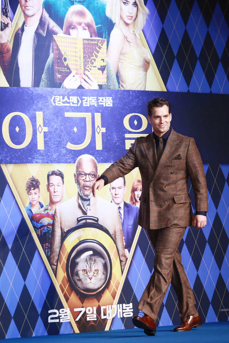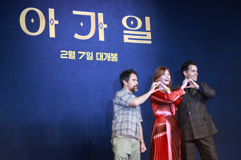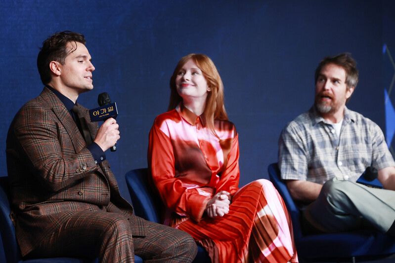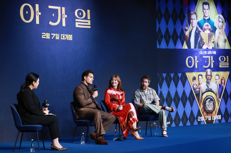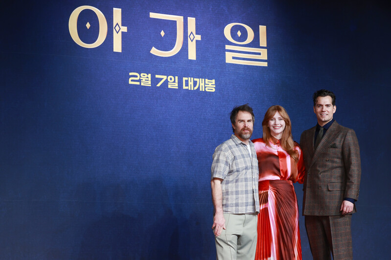 The stars of the new hollywood movie "Argylle" Sam Rockwell, Bryce Dallas and Henry Cavill posed for a photo during a publicity event in Seoul on Jan. 18, 2024. The movie will be released in South Korea on Feb. 7. (Yonhap)