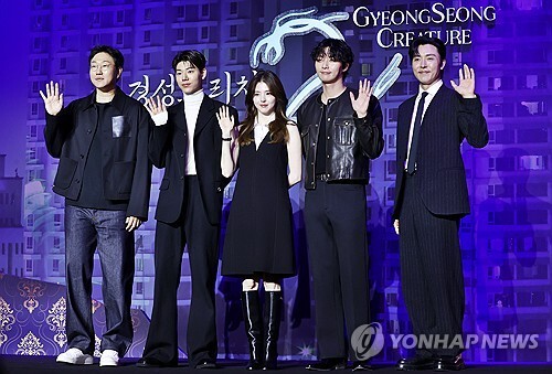| ▲ The director and actors of the Netflix series Gyeongseong Creature Season 2 pose for a photo at the production press conference held in Seoul on Sept. 25, 2024. From left: Director Jeong Dong-yoon, actors Bae Hyun-sung, Han So-hee, Park Seo-joon, and Lee Moo-saeng. (Yonhap) |