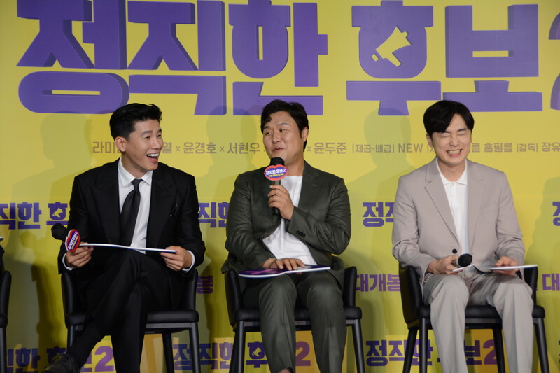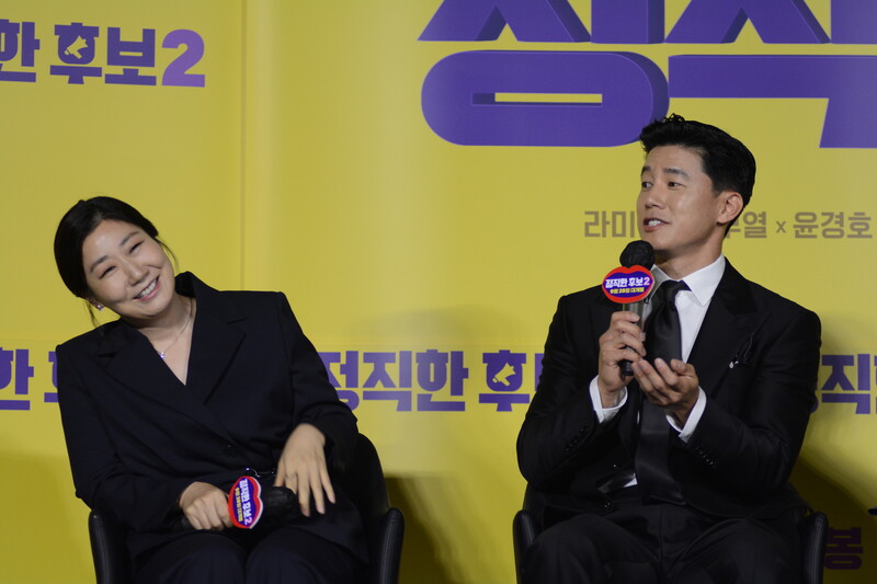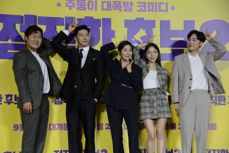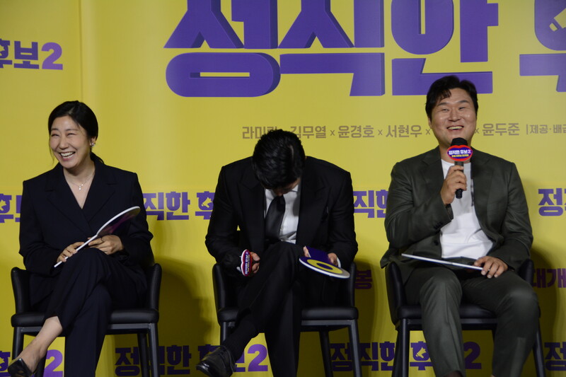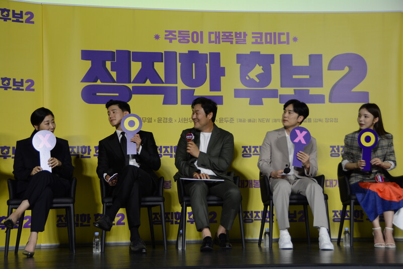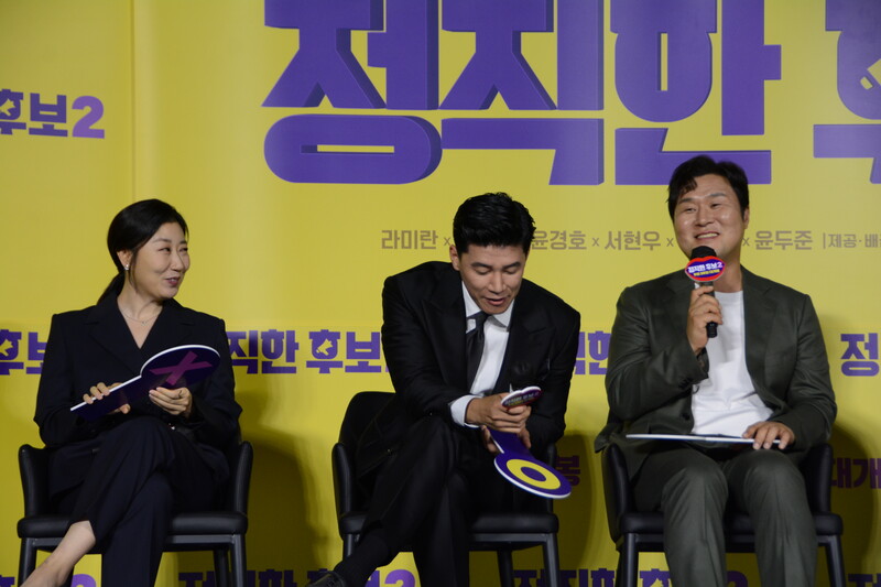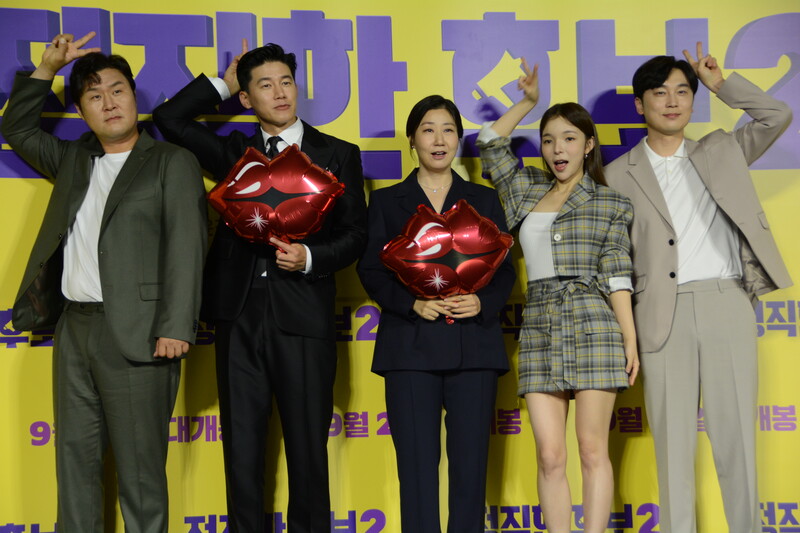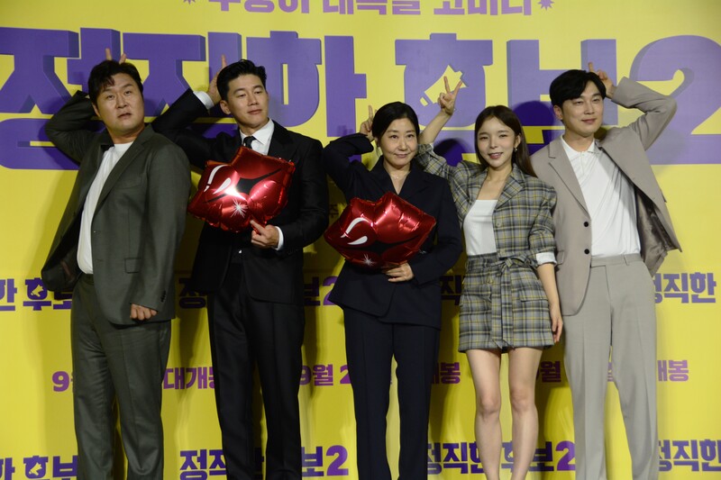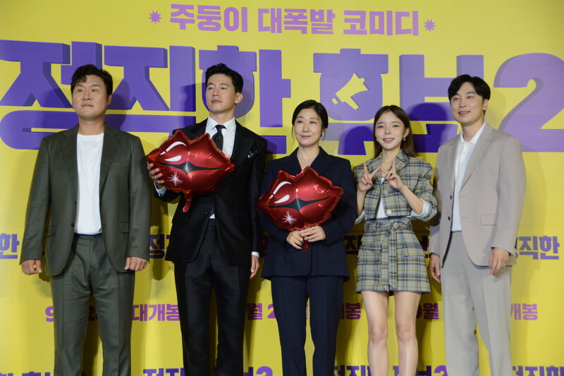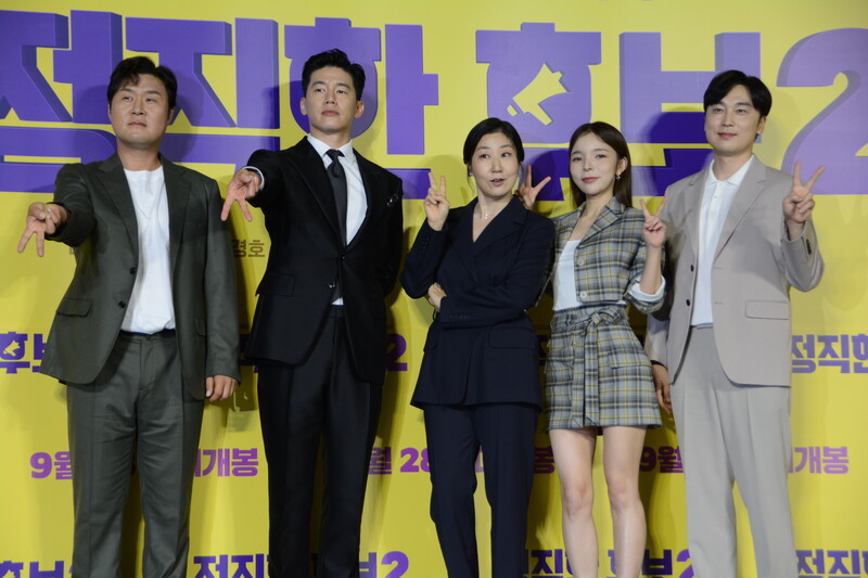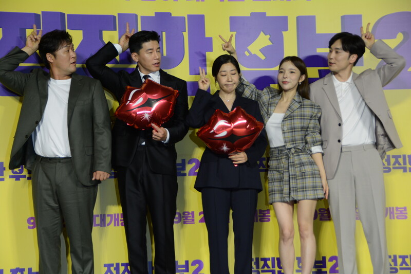 These photos, taken during the press conference of the upcoming movie "Honest Candidate 2" show, cast members Ra Mi-ran, Park Jin-joo Kim Mu-yeol, Yoon Kyung-ho and Seo Hyeon-woo.