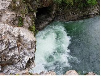 | ▲ 금강산에서 발원한 수입천 물줄기가 밤새 내린 비 때문에 굉음을 내며 쏟아져 내리고 있다. 두 암벽 사이 물이 보는 각도에 따라 흰 한반도 지도처럼 보인다. This photo shows the stream leading to Dutayeon that resonates the shape of the Korean peninsula. |
