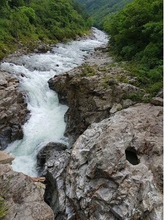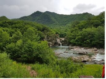 Not long after we started following the trekking course, I could hear the water roaring ahead. The valley was already flooding with rainwater that fiercely hit the ground all night like tigers growling at each other. The water running down Dutayeon was as fierce as the rain that ferociously tapped the ground last night. The water ran down the valley as if two tigers were attempting to raise their paws up high and pound on each other’s cheeks. When those tigers got clogged with each other’s paws, they then fell into a pond 10 meters below, where another bloody battle was taking place. They then all together encountered a thousand-year-old python and went after each other’s necks.