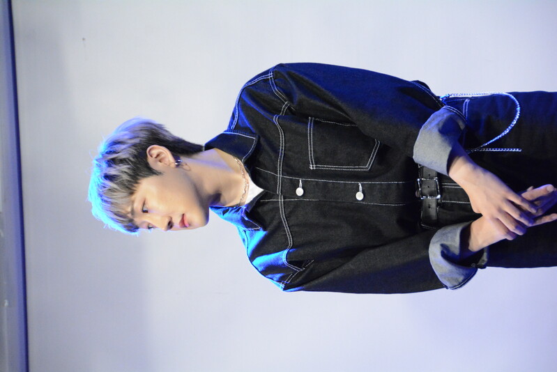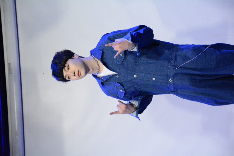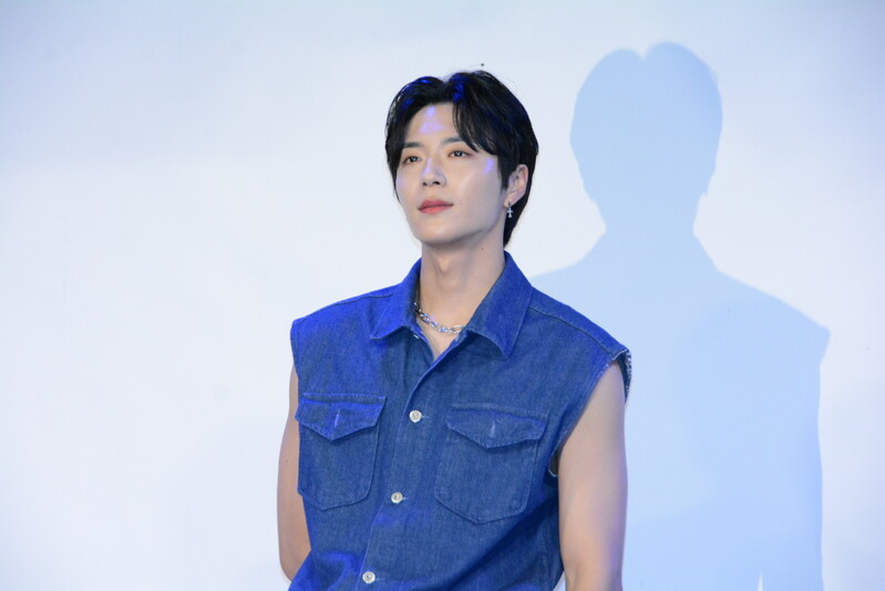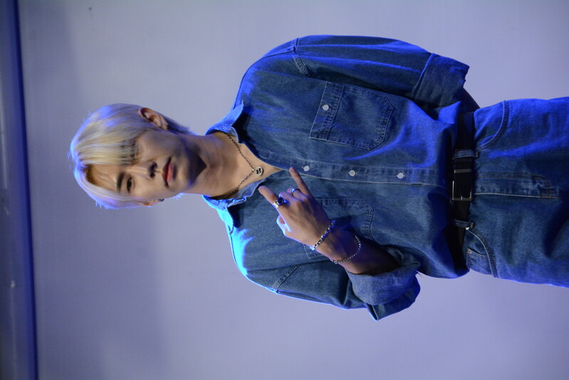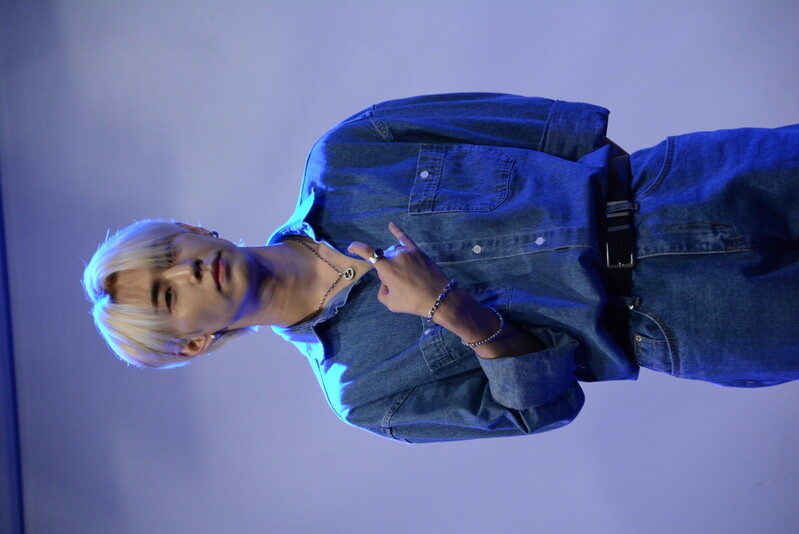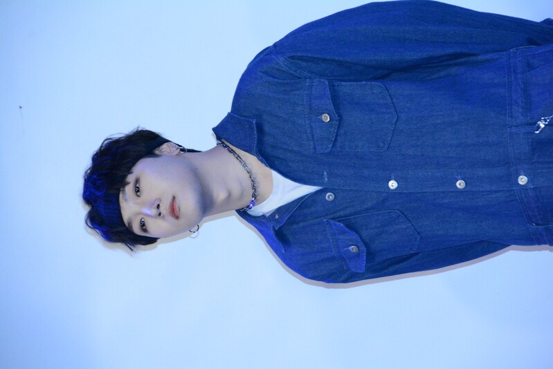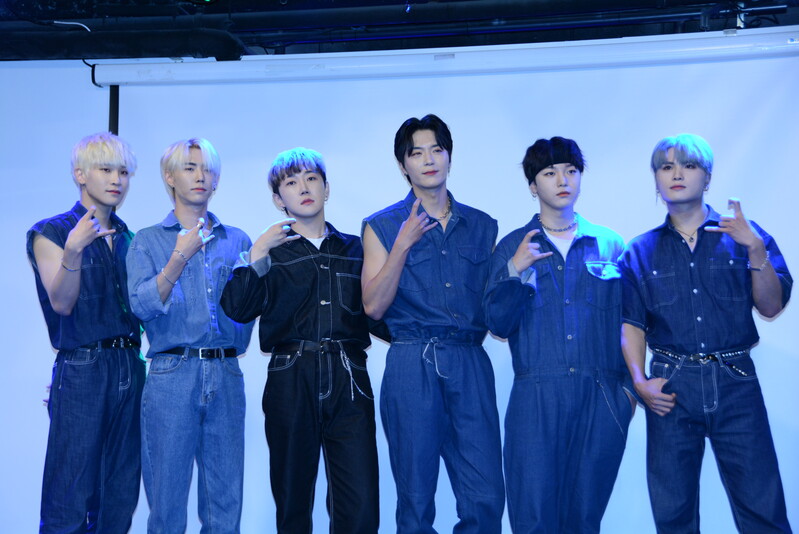 These photos, taken during the debut media showcase of K-pop boy group "ABLUE" and their debut album "Color The Start" show members pose for individual and group photos.