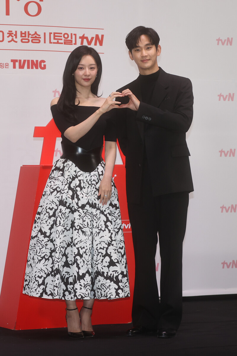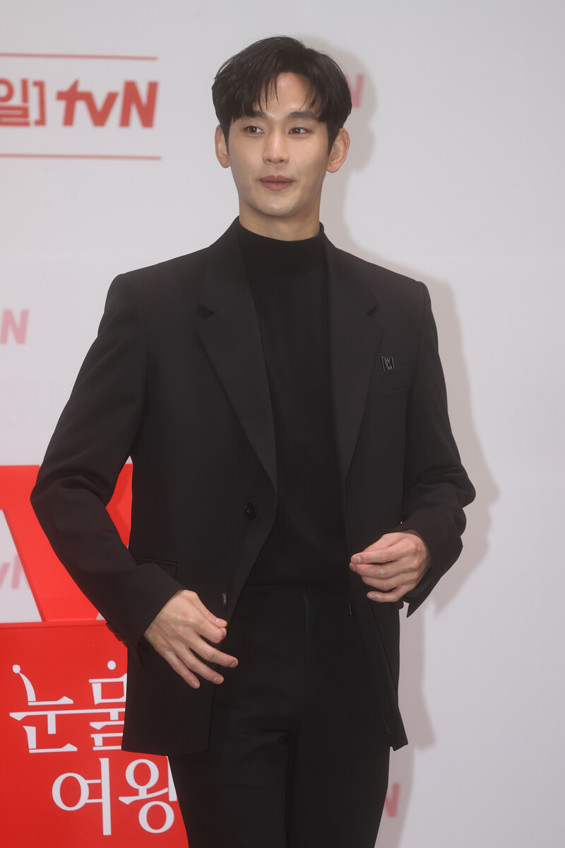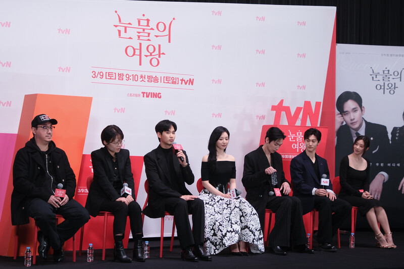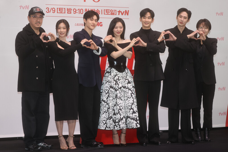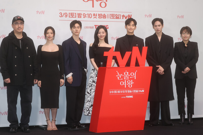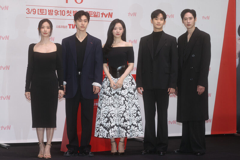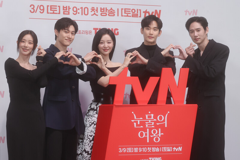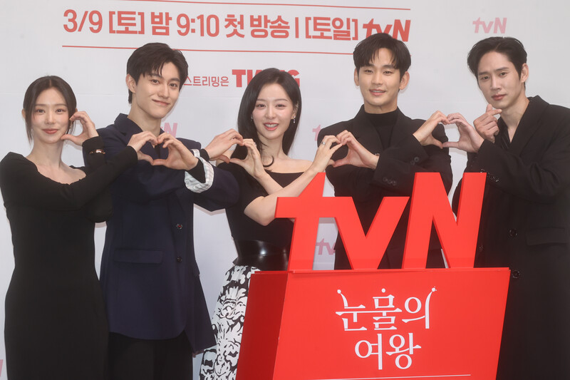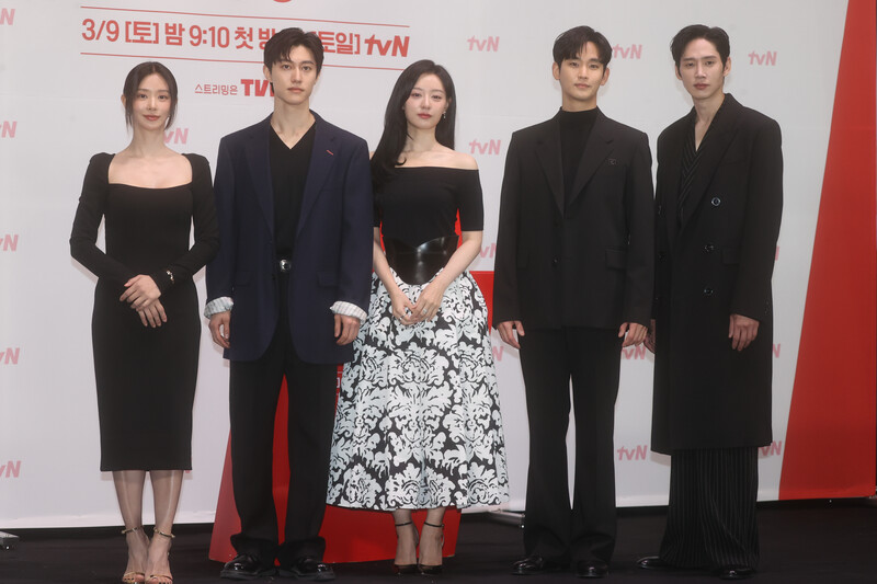 The stars of the new drama "Queen of Tears" -- Lee Joo-bin, Kwak Dong-yeon, Kim Ji-won, Kim Soo-hyun and Park Sung-hoon are posing for photos during a publicity event in Seoul on March 7, 2024. The first episode of the drama will be aired by the local cable TV network tvN on March 9. (Yonhap)