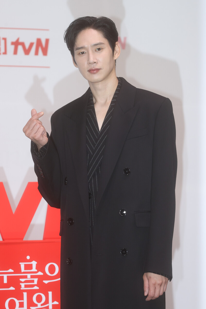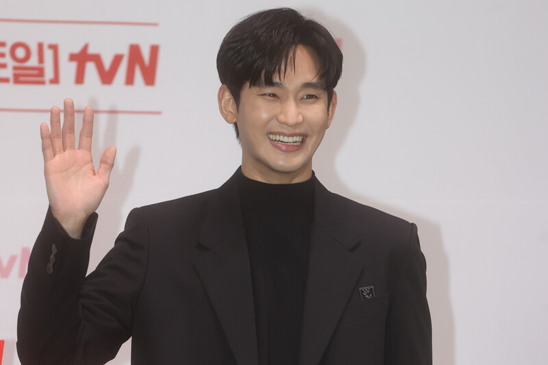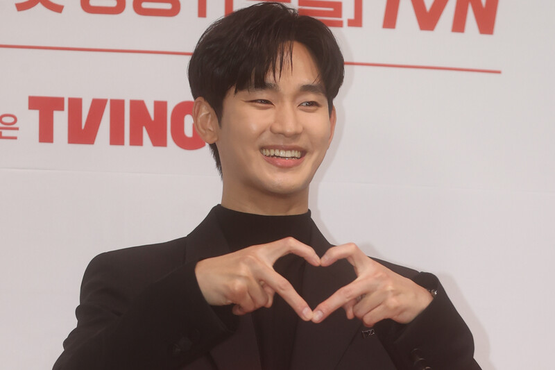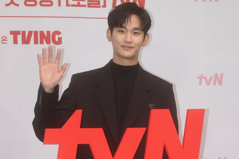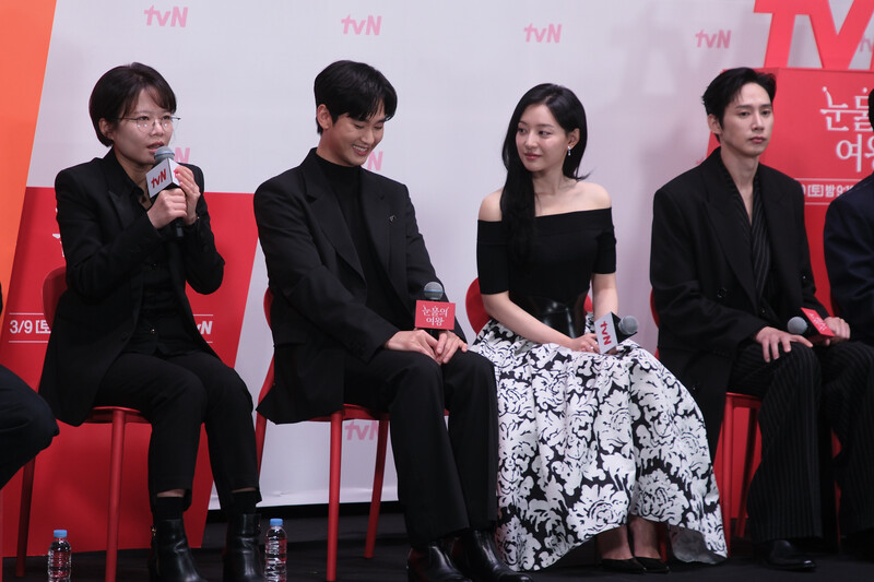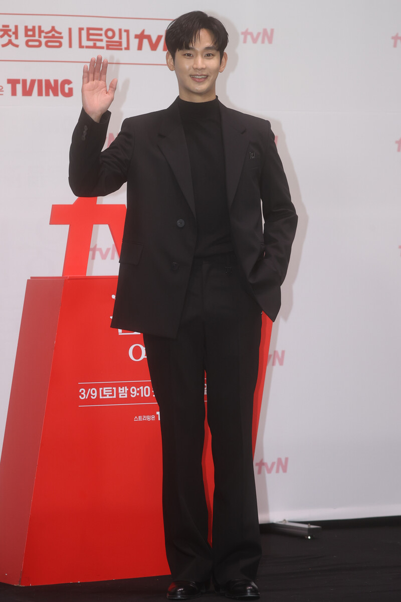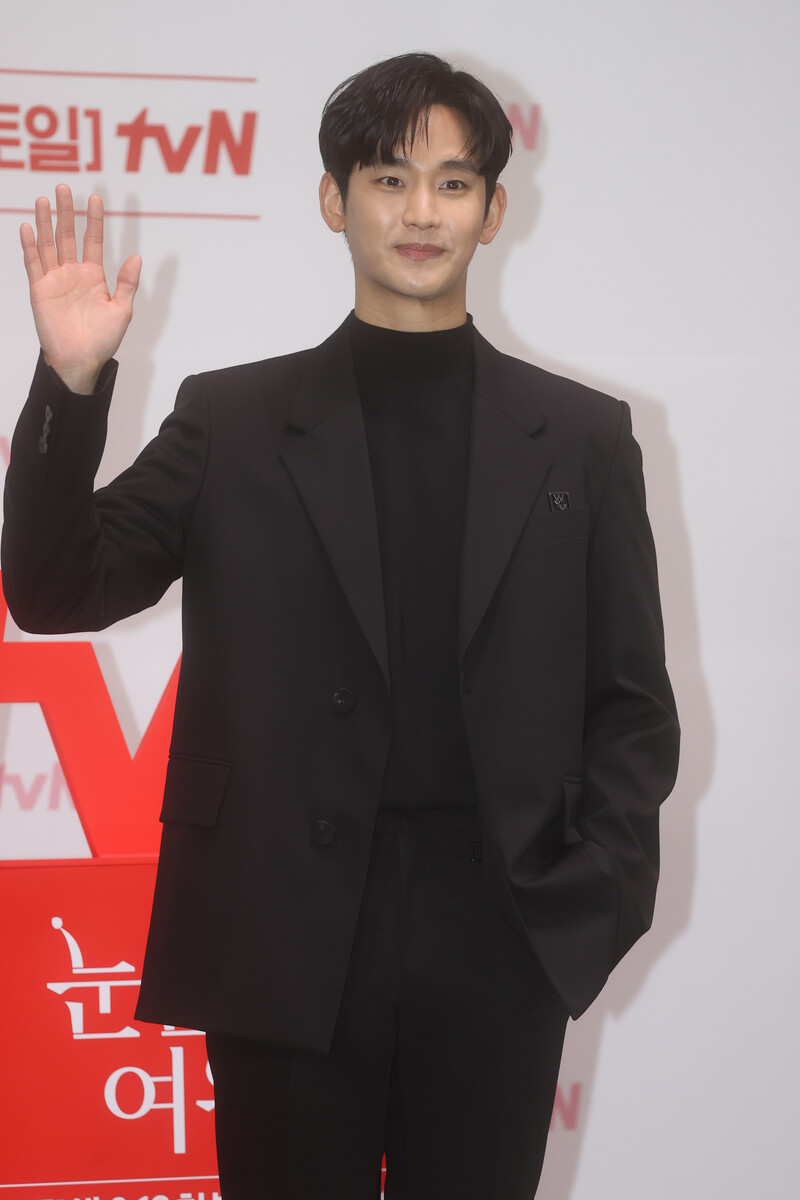 The stars of the new drama "Queen of Tears" -- Lee Joo-bin, Kwak Dong-yeon, Kim Ji-won, Kim Soo-hyun and Park Sung-hoon are posing for photos during a publicity event in Seoul on March 7, 2024. The first episode of the drama will be aired by the local cable TV network tvN on March 9. (Yonhap)