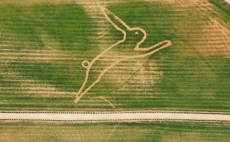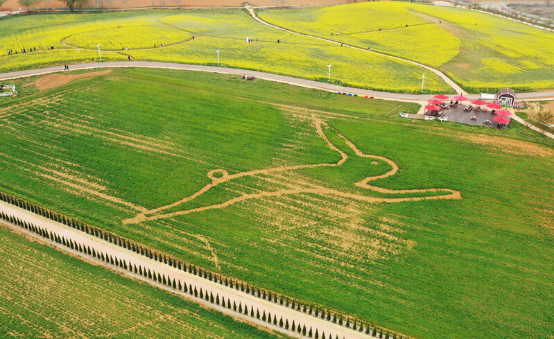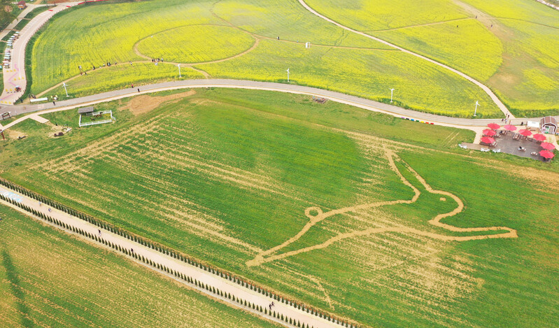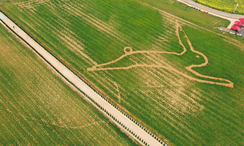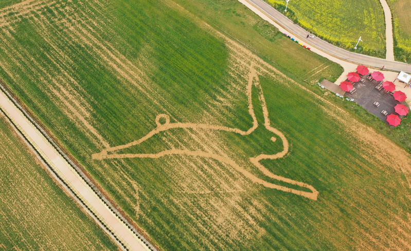 This photo, taken April 16, 2023, shows a rabbit drawn on rye fields at Anseong Farmland in the namesake city, some 64 kilometers south of Seoul, where a regional festival is being held. (Yonhap)(END)
