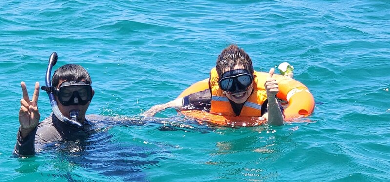 뒤이어 바다를 가르며 세 개의 섬이란 뜻인 ‘뿔라우띠가’ 해안 근처에 이르자 스노쿨링을 재도전 해보라고 한다. 그만두고 싶었지만 좀 전에 수고롭게도 바닷속에서 끝까지 나를 챙겨 준 가이드, 마이크를 믿고 다시 물속으로 풍덩 뛰어들었다.