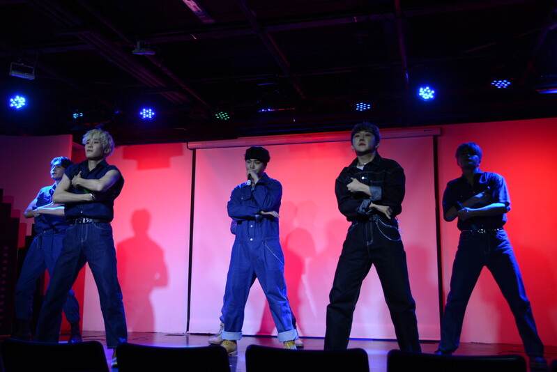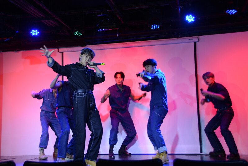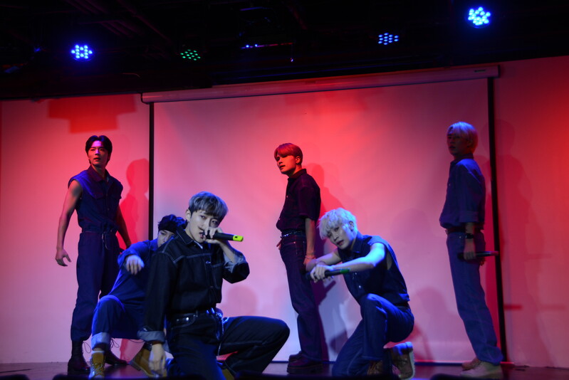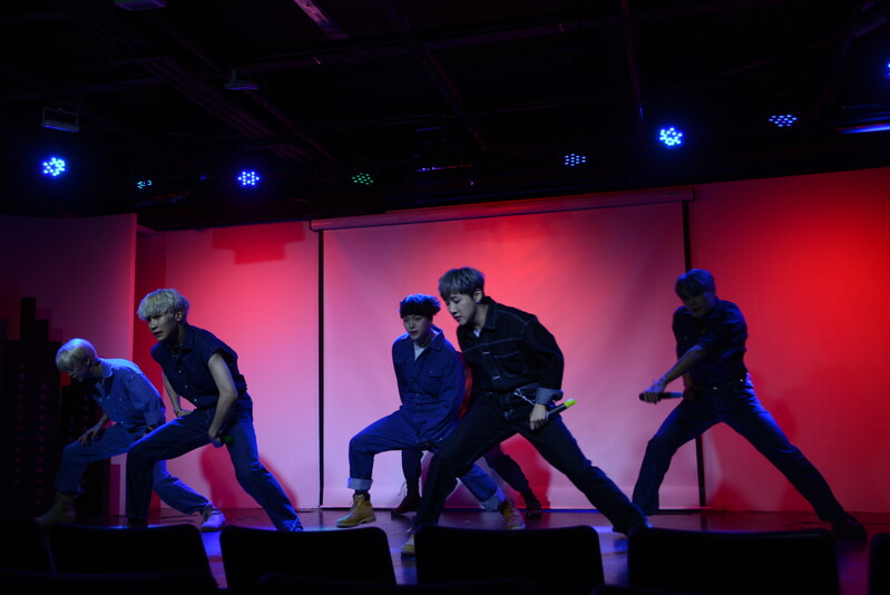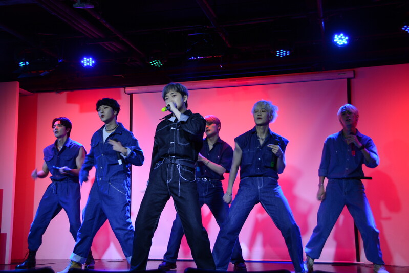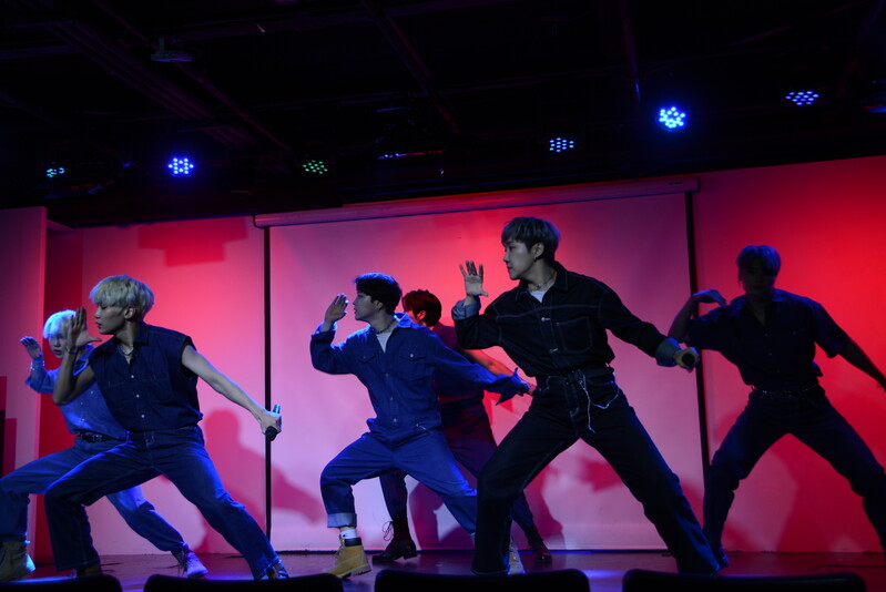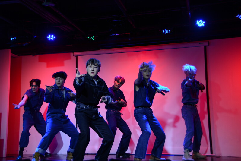 These photos, taken during debut media showcase of K-pop boy group ABLUE show members performing their title track "Carnival" from group's debut album "Color the Start."