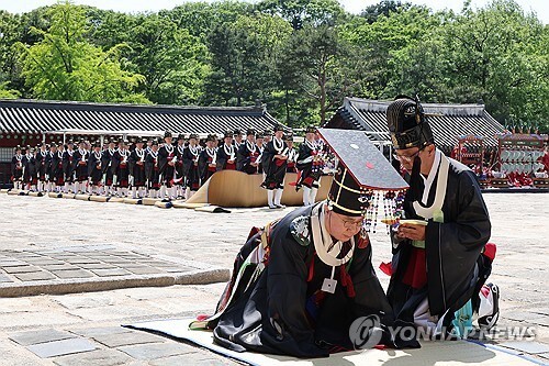 ▲ In this file photo, officials participate in an annual royal ancestral ritual at Jongmyo Shrine in Seoul on May 4, 2025, known as "Jongmyo Daeje." The ritual honors the past kings and queens of the Joseon Dynasty (1392-1910). (Pool photo) (Yonhap)