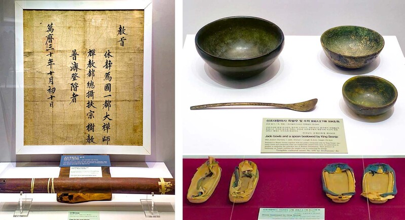 | ▲ These photos show King Seonjo's royal edict of appointing Seosan Daesa as the commander of the warrior monks (L) and the utensil and shoes used by Seosan Daesa. (Yonhap) |