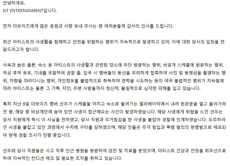 | ▲ This statement from IST Entertainment, the management of The Boyz, was captured from the band's official fan club website. (PHOTO NOT FOR SALE) (Yonhap) |