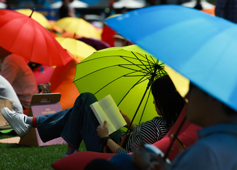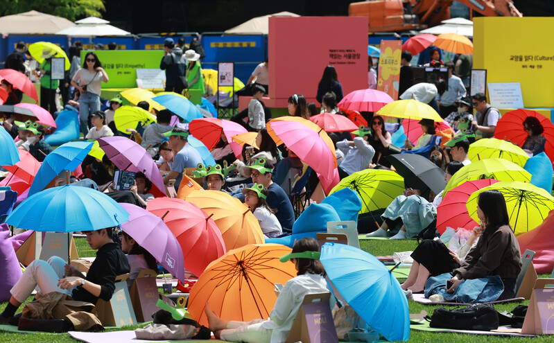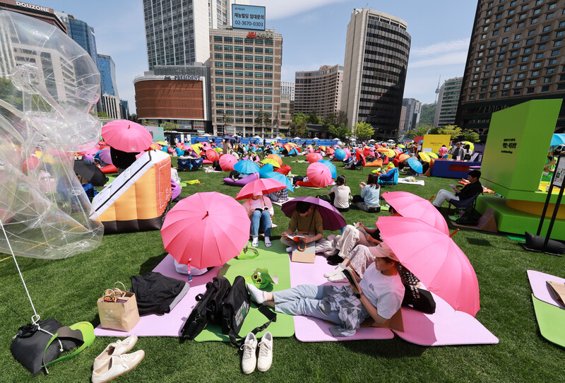 A crowd of people takes part in "Reading at Seoul Plaza" on the grassy area in front of Seoul City Hall on April 23, 2023. (Yonhap)(END)