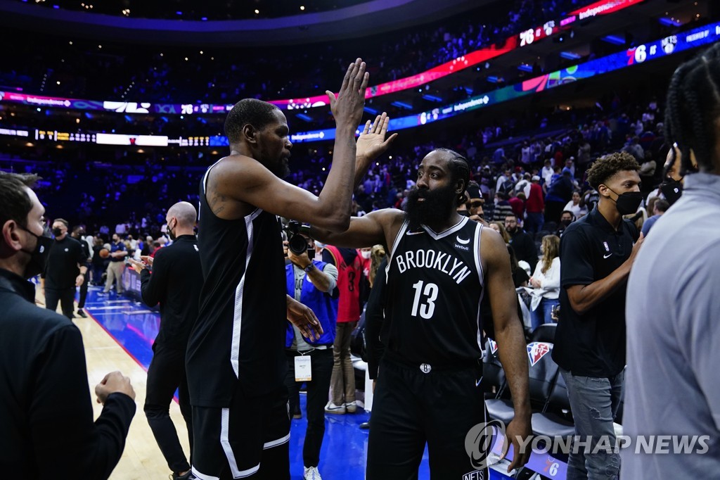 | ▲ 시즌 첫 승을 기뻐하는 브루클린의 하든(13번)과 듀랜트. [AP=연합뉴스] |