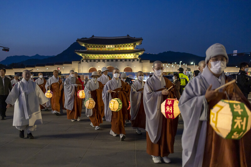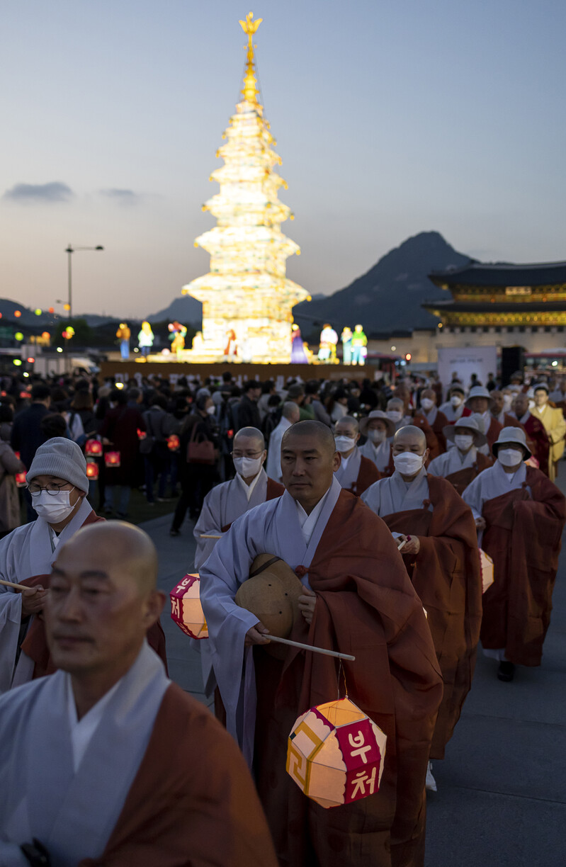 Buddhist monks circle a large pagoda-shaped lantern during a lighting ceremony at Gwanghwamun Square in Seoul on April 26, 2023, in preparation for Buddha's Birthday, which falls on May 27 this year. (Yonhap)