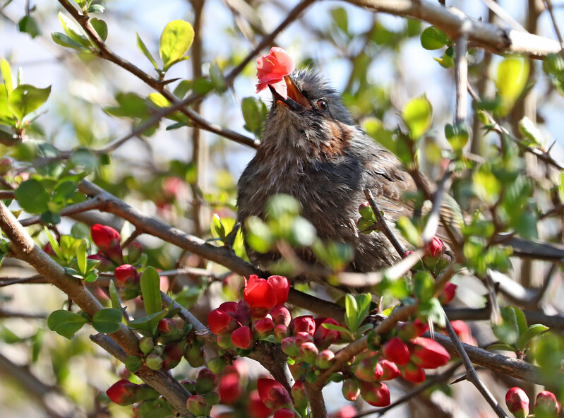 On the 30th, a brown-eared bulbul tastes flowers from a residential Myeongja tree in Jukheon-dong, Gangneung-si, Gangwon-do.(Yonhap)