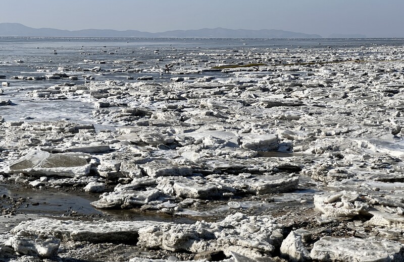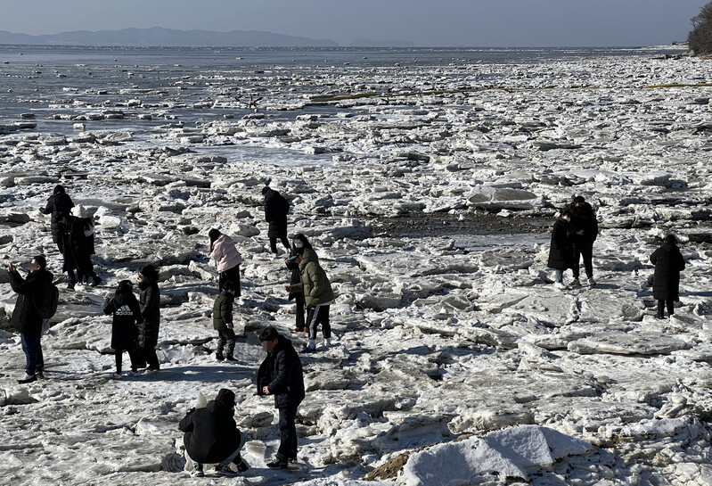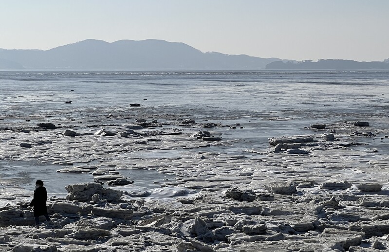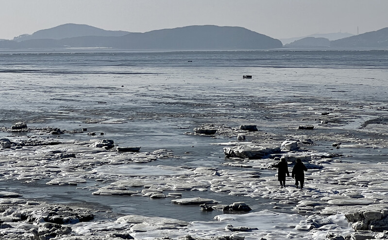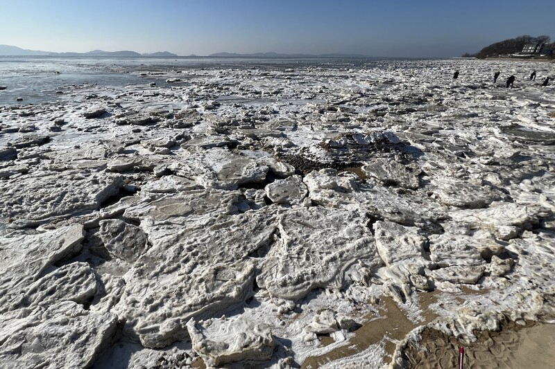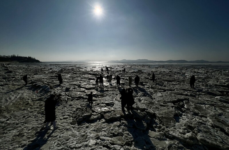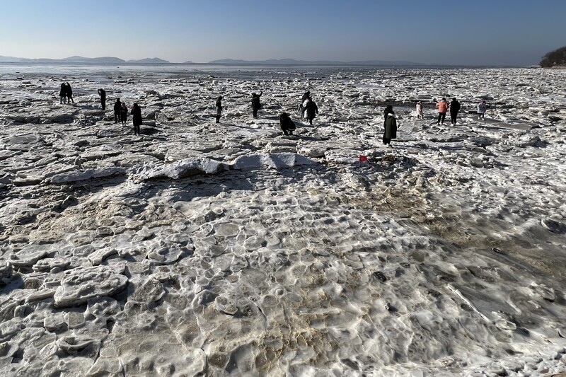 People walk on frozen seawater at Dongmak Beach on Gangwha Island, Incheon, on Dec. 25, 2022. (Yonhap)