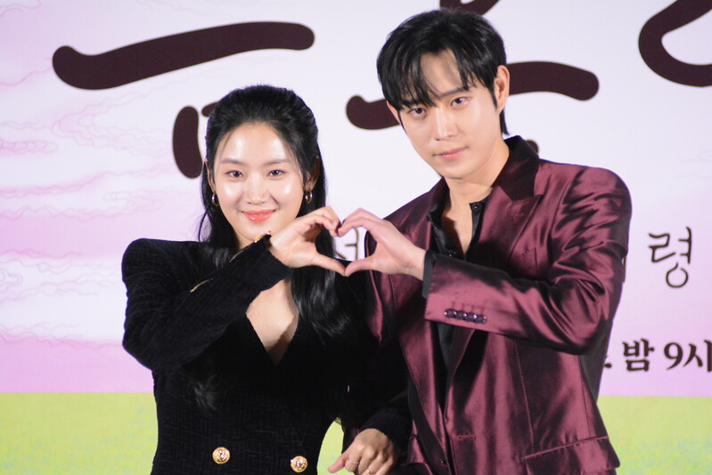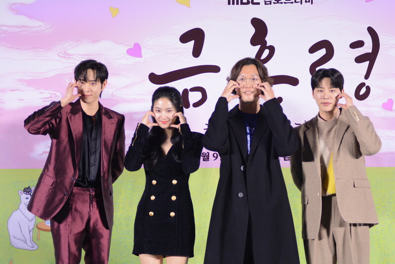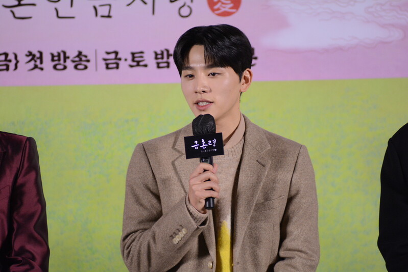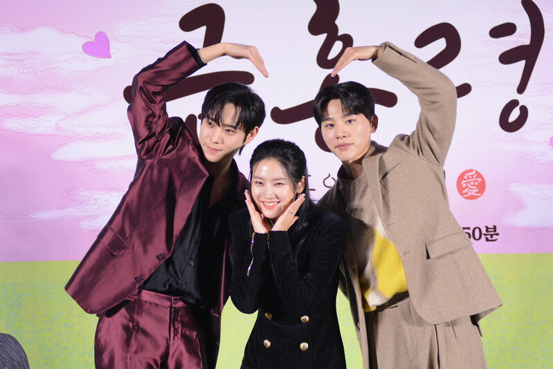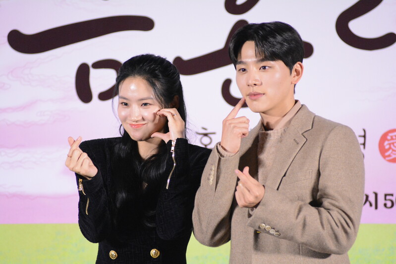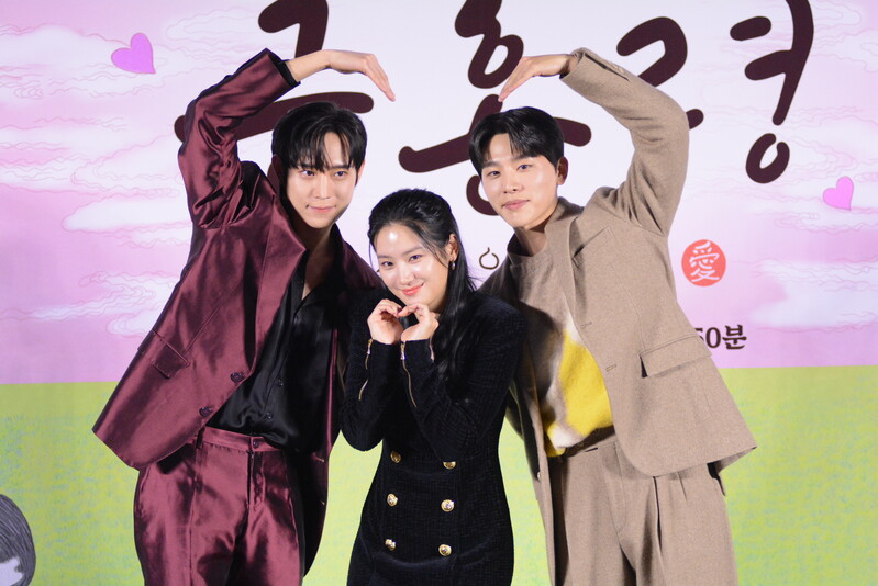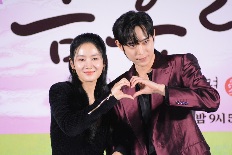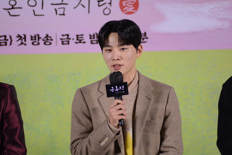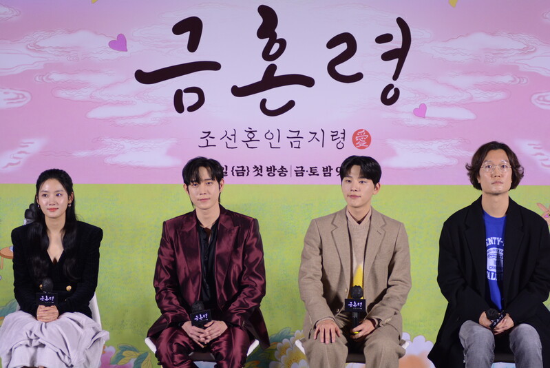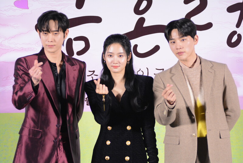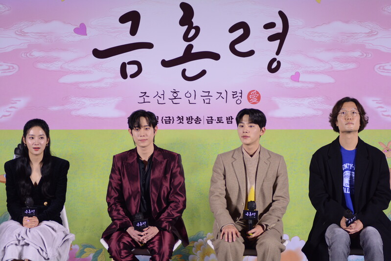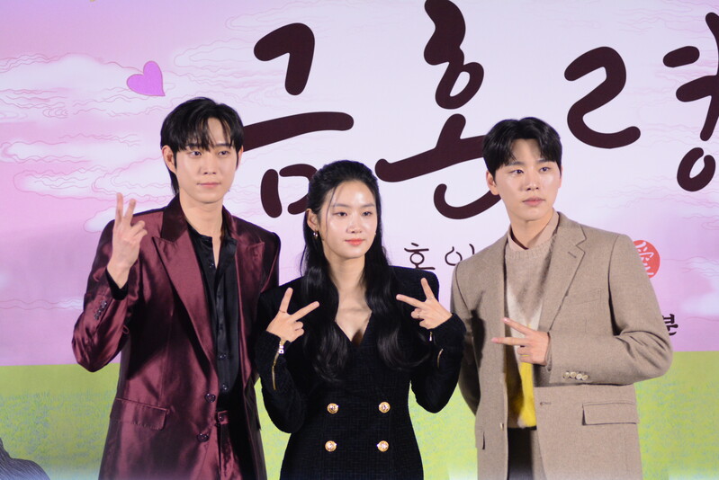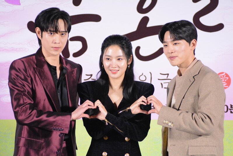 These photos taken during the press conference of MBC's upcoming drama series "The Forbidden Marriage" featuring actor Kim Young-dae, Kim Woo-seok and actress Park Ju-hyun show cast members posing for photos and answering to questions.