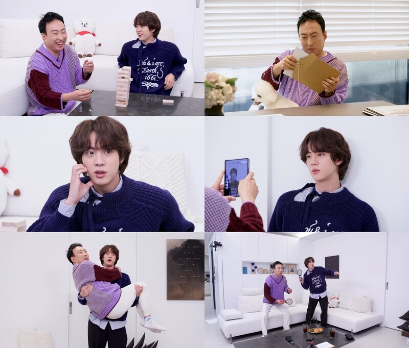 Jin appeared on JTBC's YouTube channel "HalMyungsoo," hosted by comedian Park Myung-soo, on Monday. Park Myung-soo and Jin met for the first time, held a talk show in an awkward atmosphere, and carried out missions such as "Hugging the Princess," "10-Second Eye Contact," and "Three Aegyos" through the Friendship Jenga Game. The video will be released at 5:30 p.m.