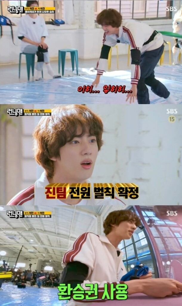 In the last mission, where the members had to fight with the opponent while tied to a string, unlike the powerful performance Jin showed on stage, Jin made everyone laugh, as he was being swayed like a "paper doll." Jin used the chance to change teams before the final penalty and showed his perfect performance in a variety show.