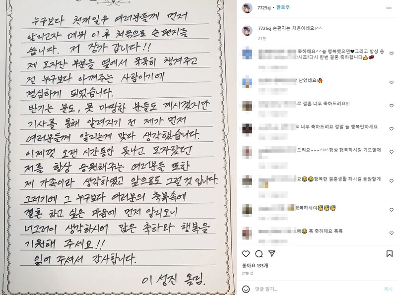 SEOUL, Feb. 10 (Yonhap) -- Group NRG’s Lee Sung-jin announced his marriage on his social media with a handwritten letter, Thursday.
