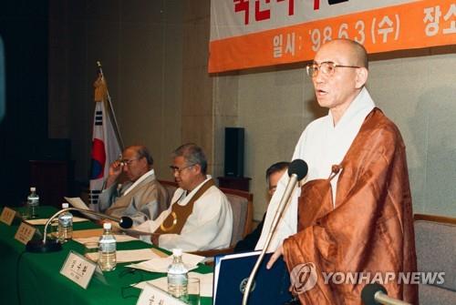 | ▲ In this file photo taken June 3, 1998, Ven. Wolju speaks at a press conference in Seoul. (Yonhap) |