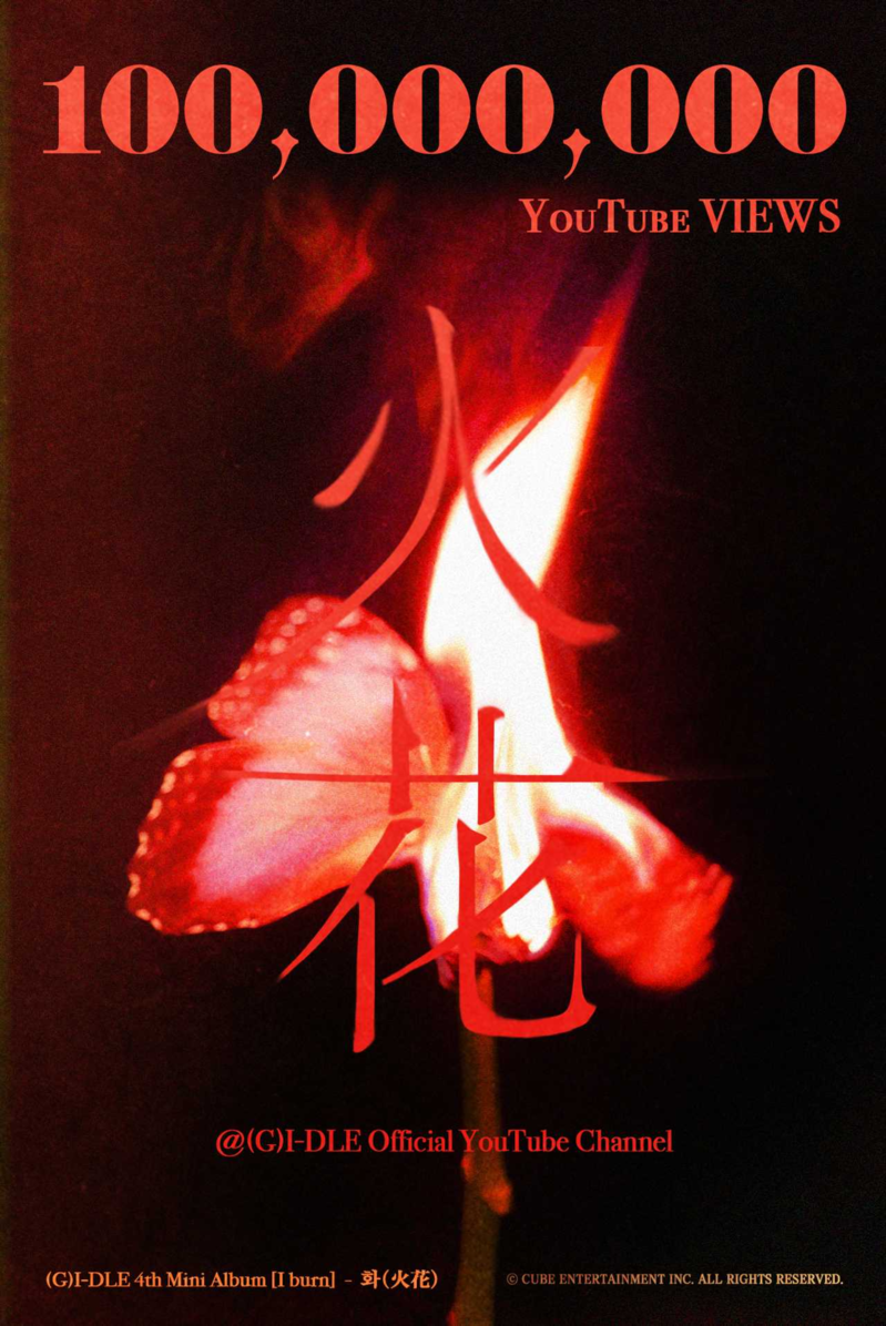 This photo, provided by Cube Entertainment, marks the 100 million YouTube views of (G)I-DLE’s “HWAA” music video on June 14th, 2022.