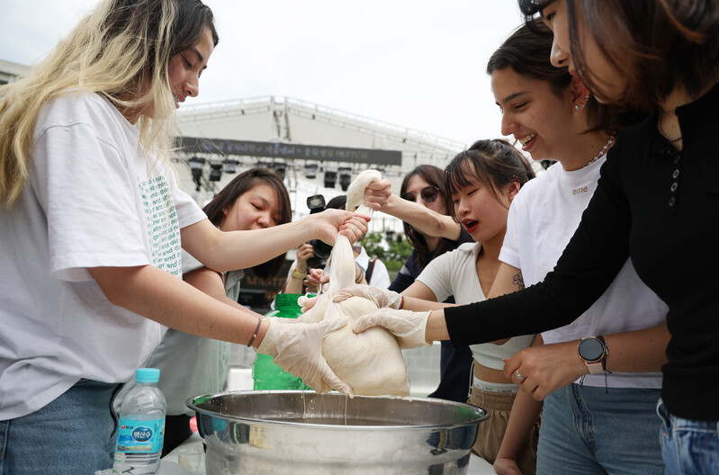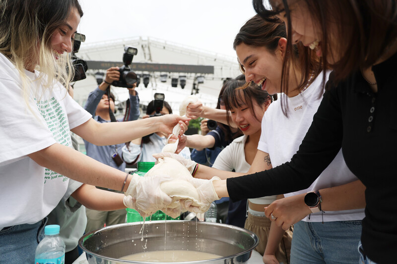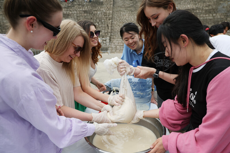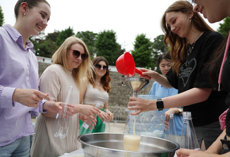 Foreign students have the opportunity to experience making traditional Korean liquor at Kyunghee University in Seoul on May 24, 2023. (Yonhap)