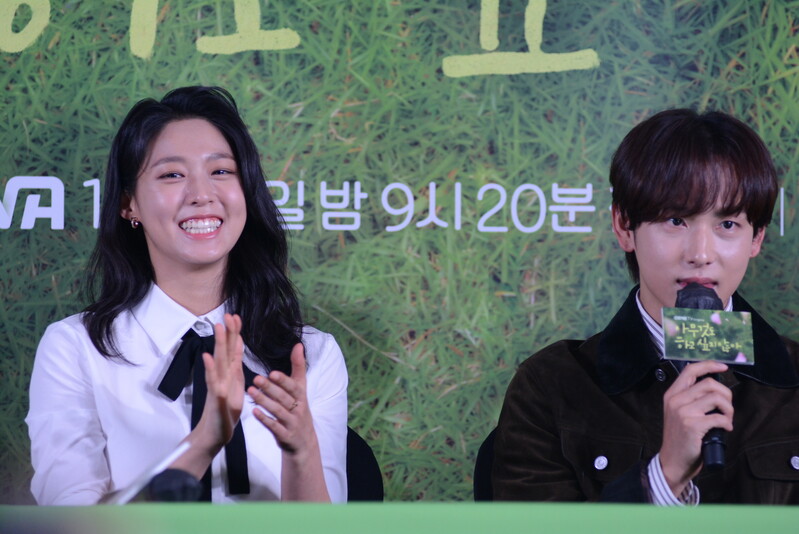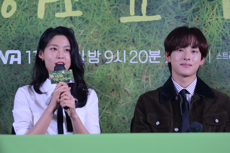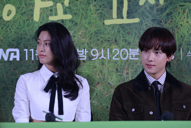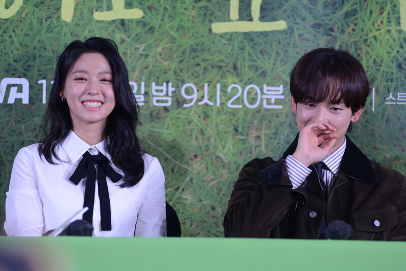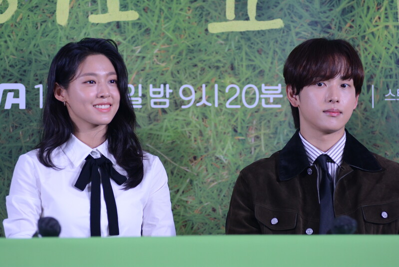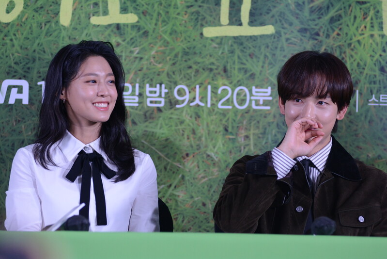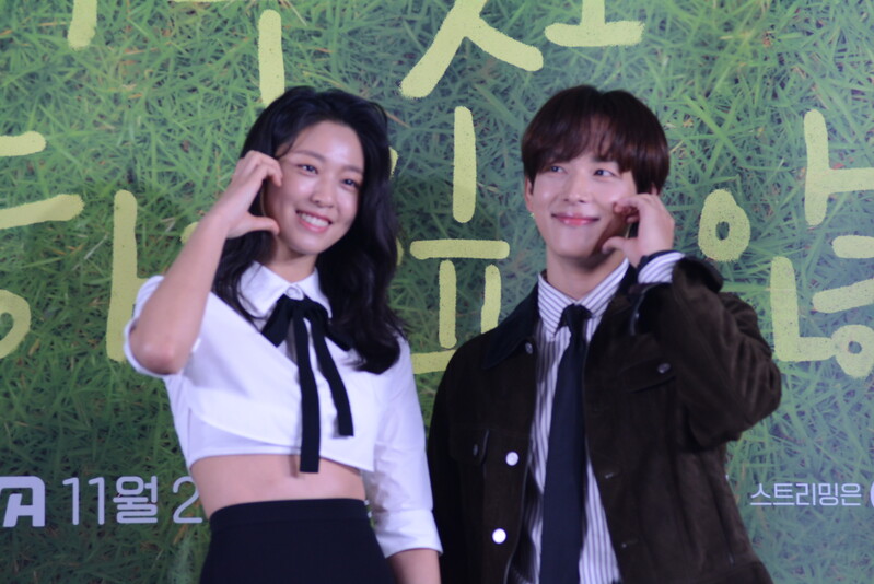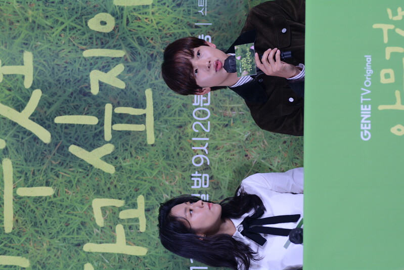 These photos, taken during the press conference of the upcoming drama "Summer Stike" show actress Kim Seol-hyun and actor Im Si-wan posing for their individual and group photos and answering to questions throughout the press conference.
