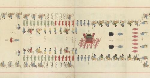 | ▲ Portion of the Uigwe of the Royal Wedding Ceremony for Queen Inhyeon of King Sukjong – a section of the Banchado, depicting the procession as King Sukjong escorts Queen Inhyeon back to the palace. (PHOTO NOT FOR SALE) (Yonhap) |