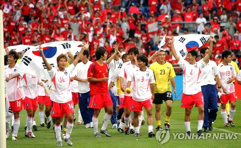 | ▲ This file photo shows the group of South Korean football players in the 2002 Korea-Japan World Cup after winning the match. (PHOTO NOT FOR SALE) (Yonhap) |