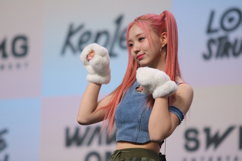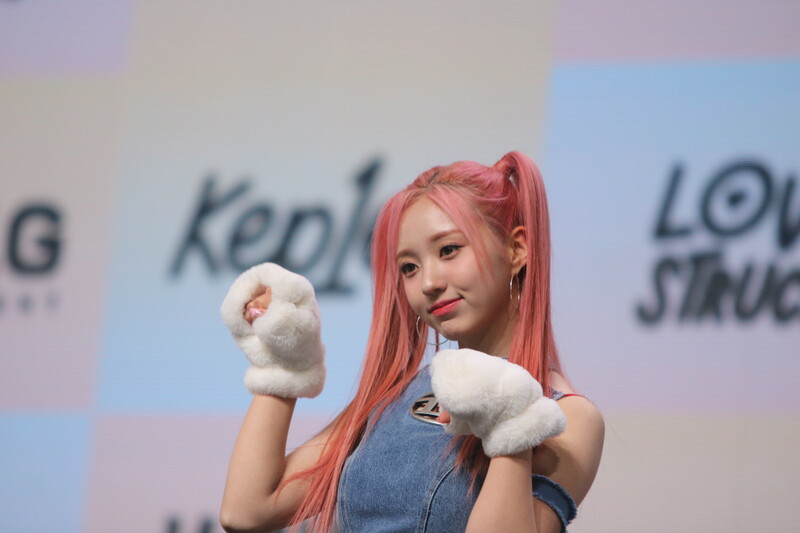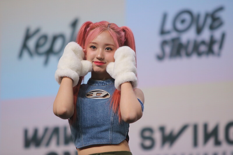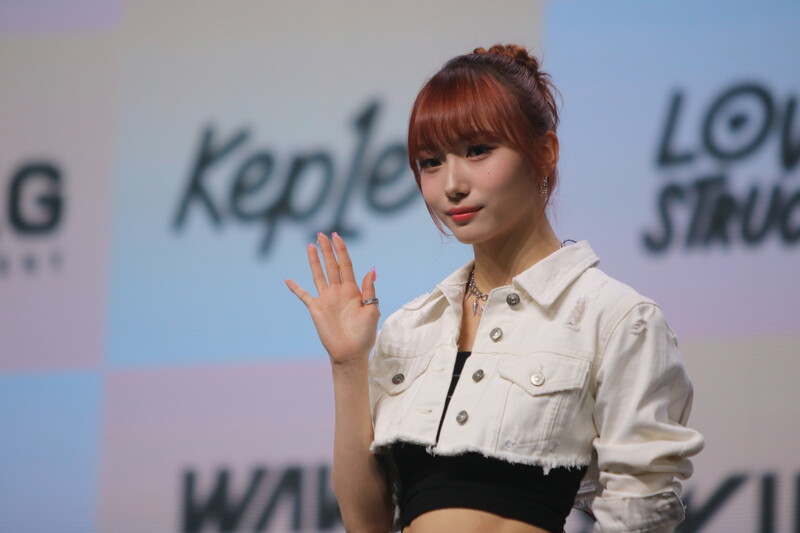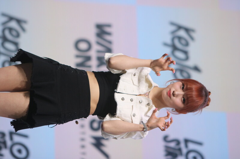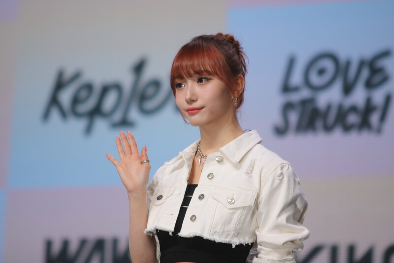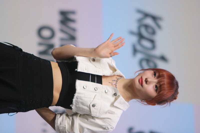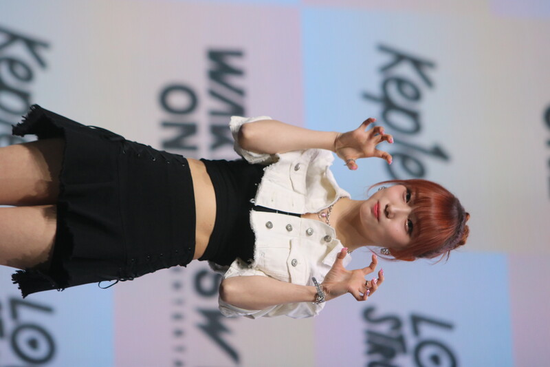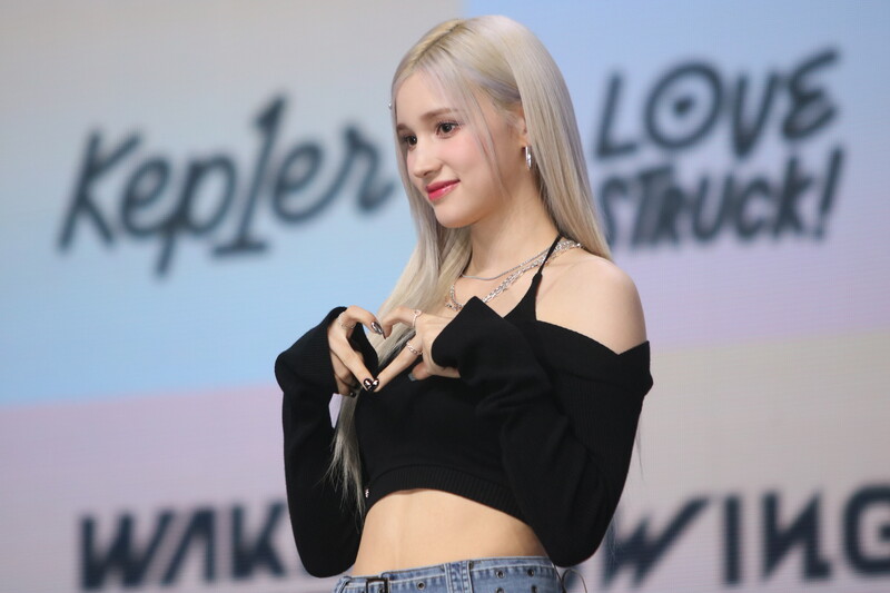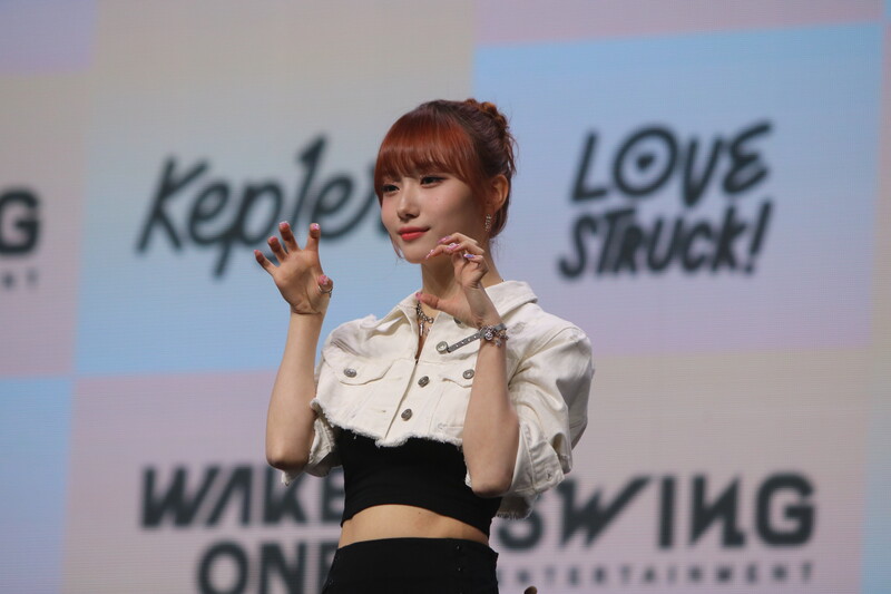 These photos show Kep1er's Huening Bahiyyih, Seo Young-eun, and Kang Ye-seo during the media showcase of the nine-piece group's fourth mini album "LOVE STRUCK!," led by title track "Giddy."