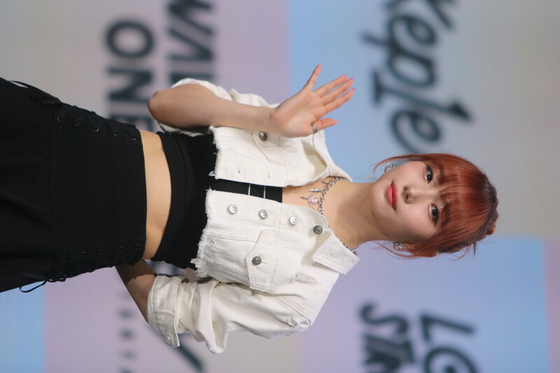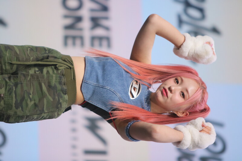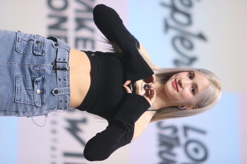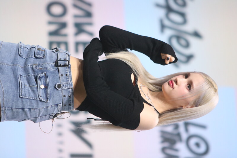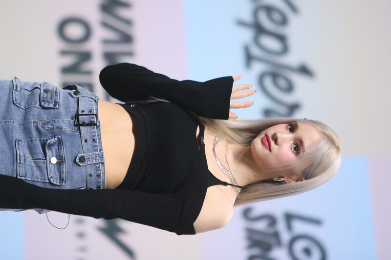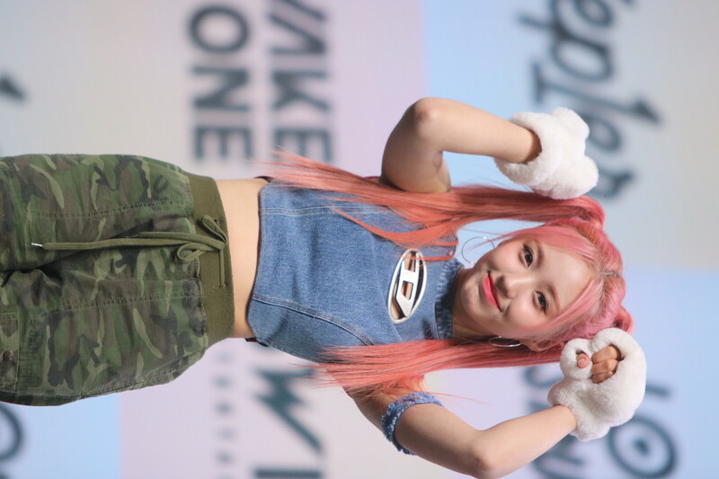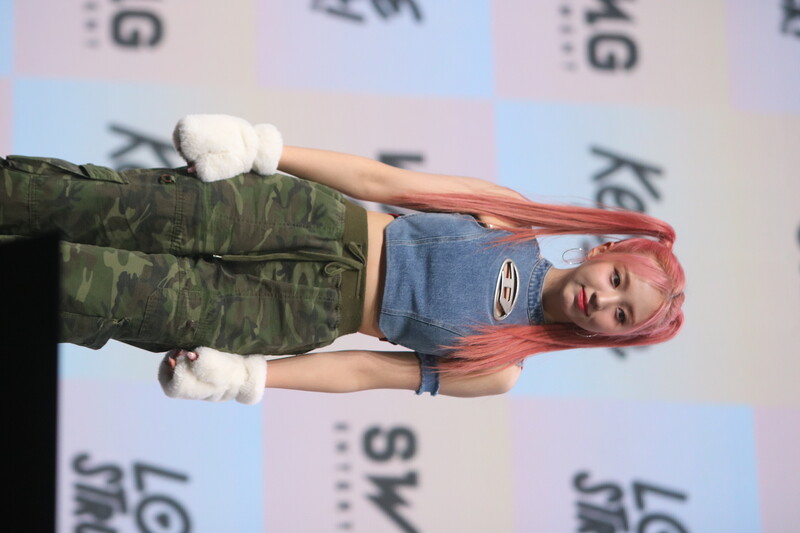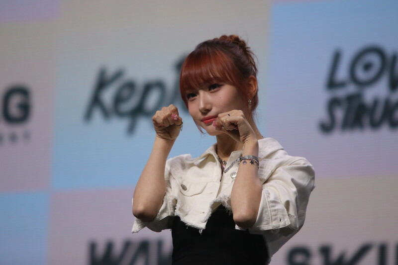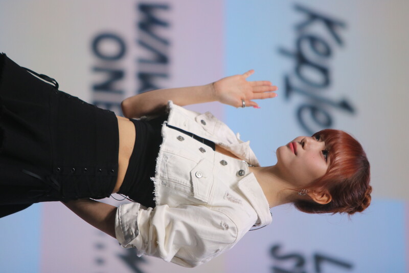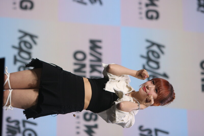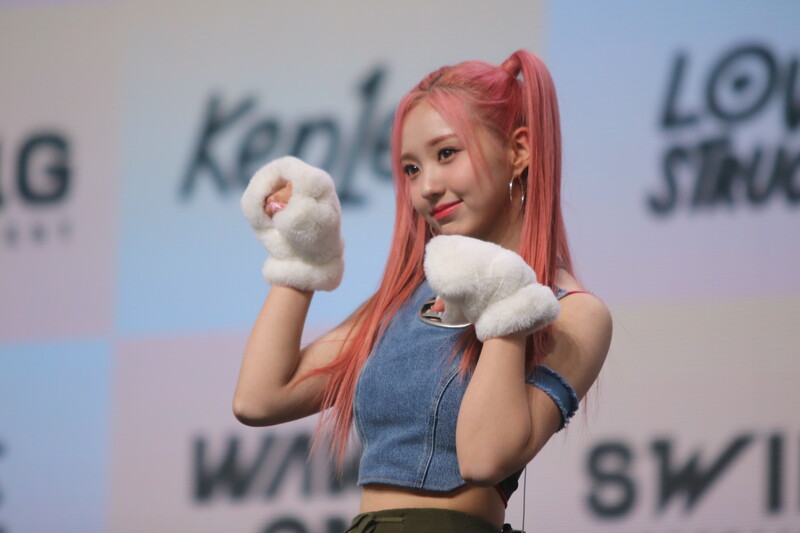 These photos show Kep1er's Huening Bahiyyih, Seo Young-eun, and Kang Ye-seo during the media showcase of the nine-piece group's fourth mini album "LOVE STRUCK!," led by title track "Giddy."