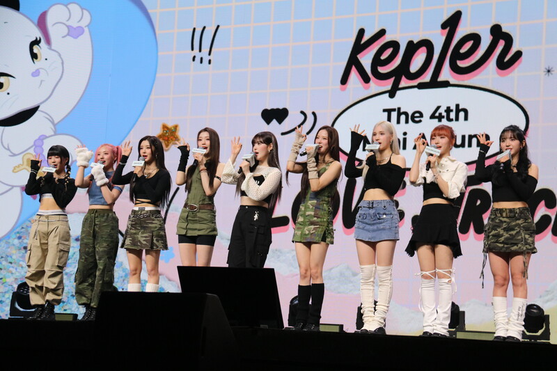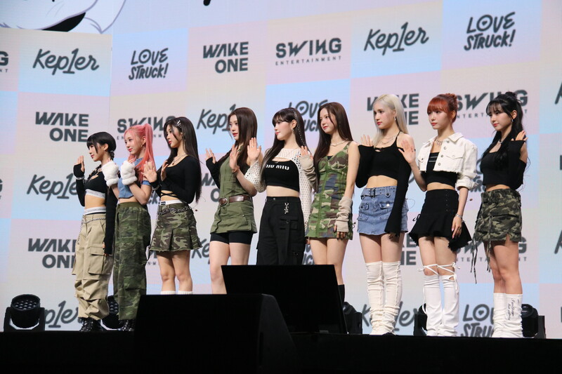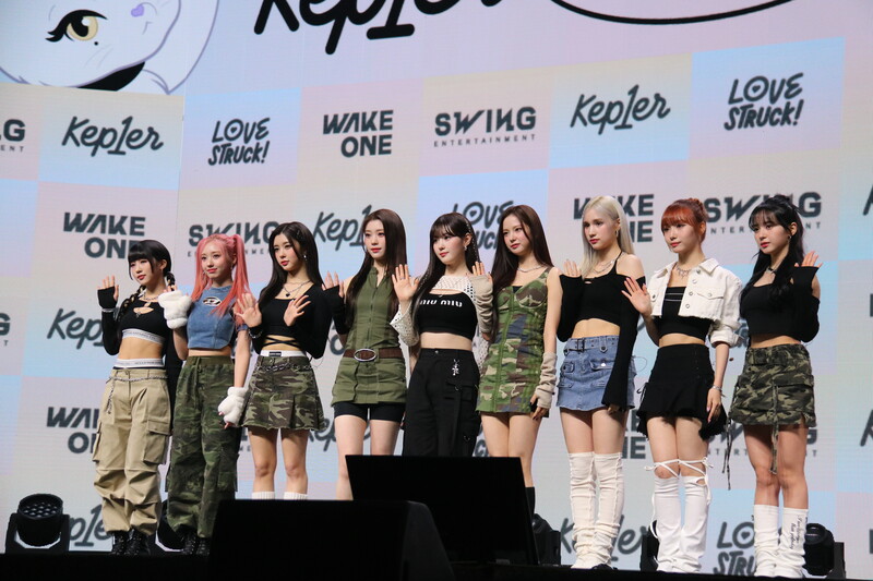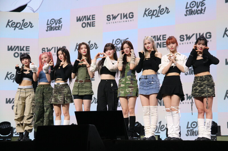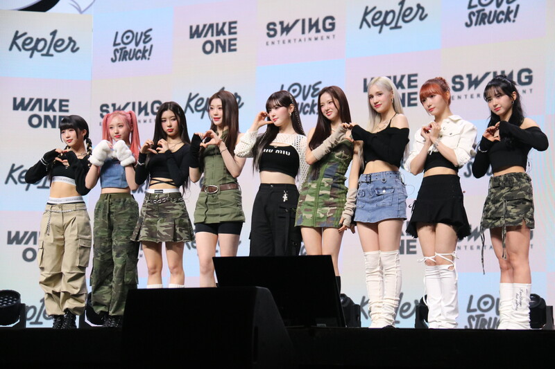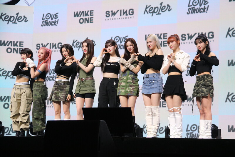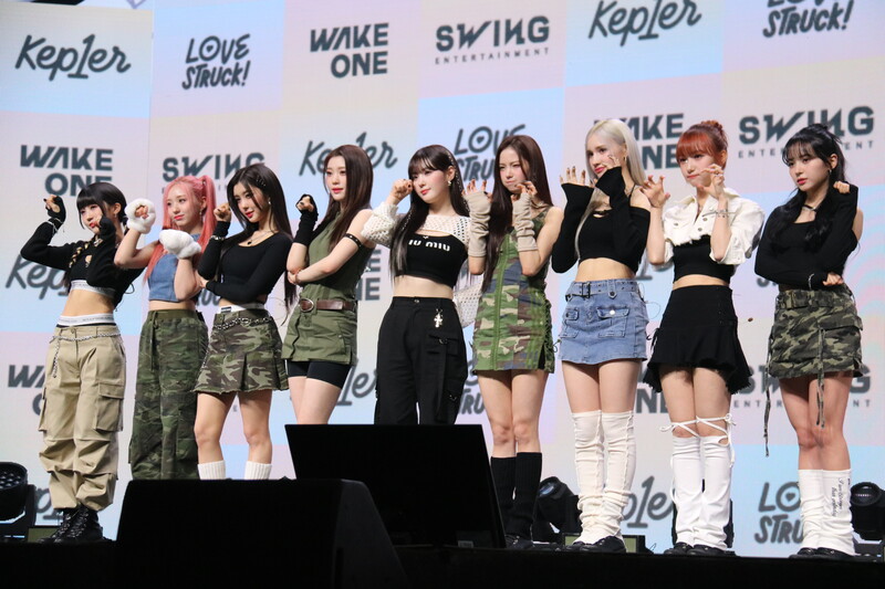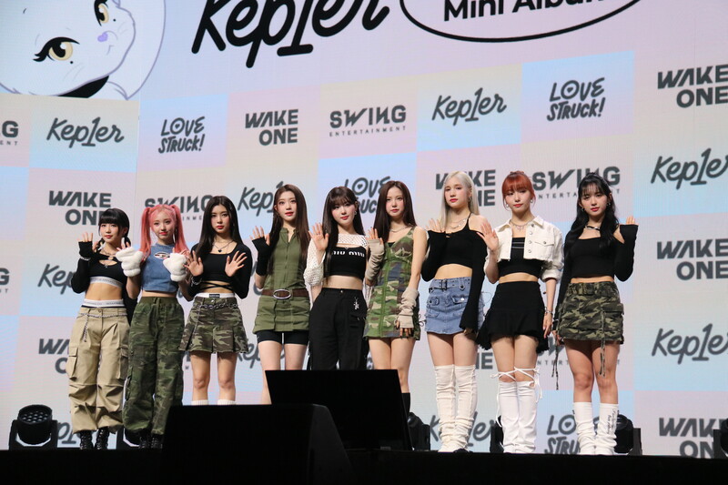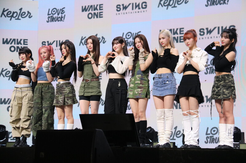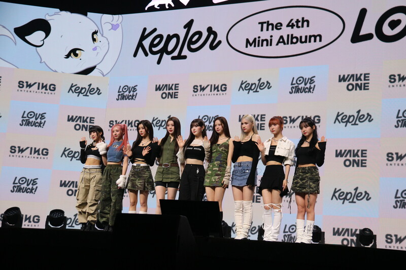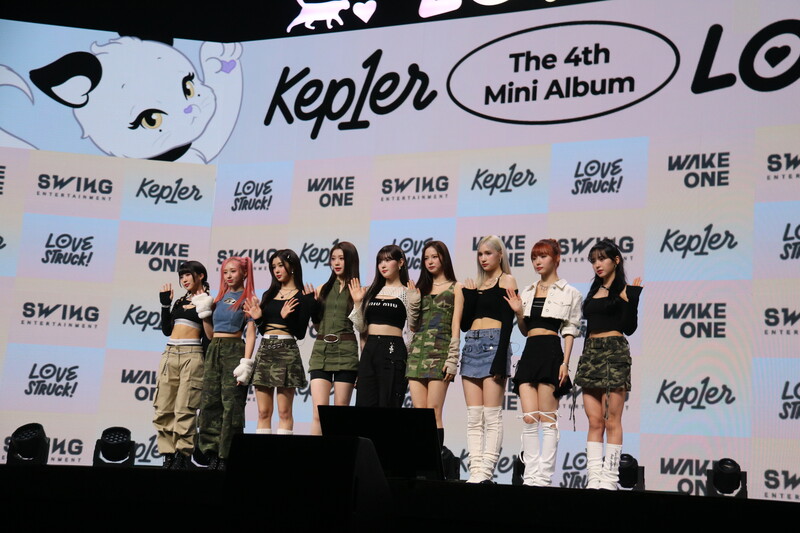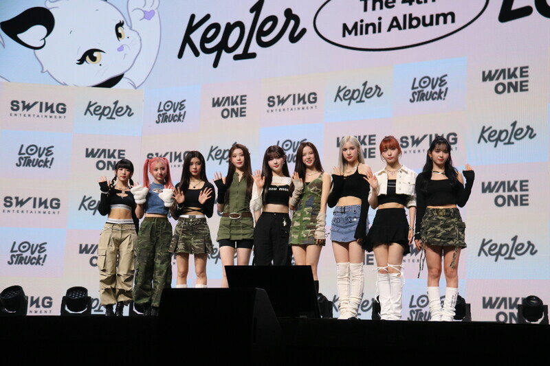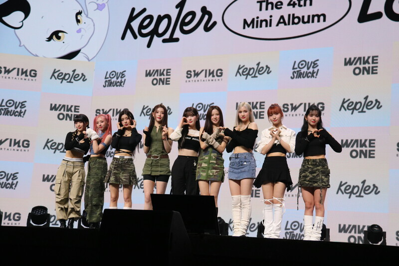These photos show all nine members of Kep1er during the media showcase of the nine-piece group's fourth mini album "LOVE STRUCK!," led by title track "Giddy."
