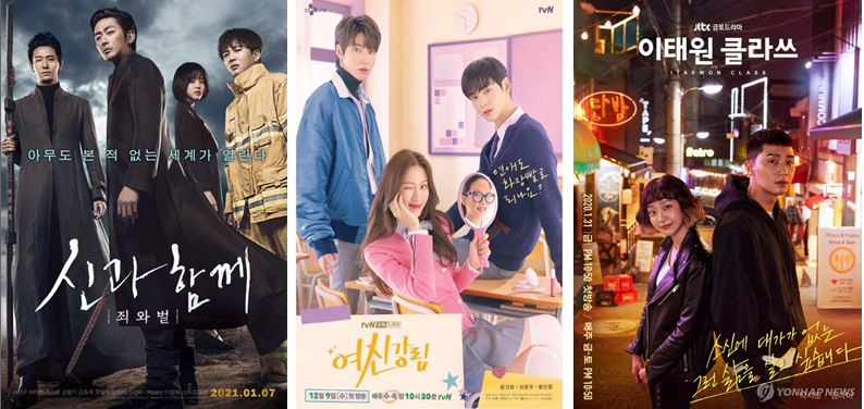 | ▲ These pictures provided by Lotte Entertainment, tvN, and JTBC shows the movie and drama posters for "Along with the Gods," "True Beauty," and "Itaewon Class" respectively. (PHOTO NOT FOR SALE) (Yonhap) |