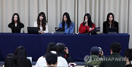 ▲ In this file photo, the five members of K-pop girl group NewJeans attend a press conference in Seoul on Nov. 28, 2024, to announce a decision to terminate their exclusive contracts with ADOR. (Pool photo) (Yonhap) |